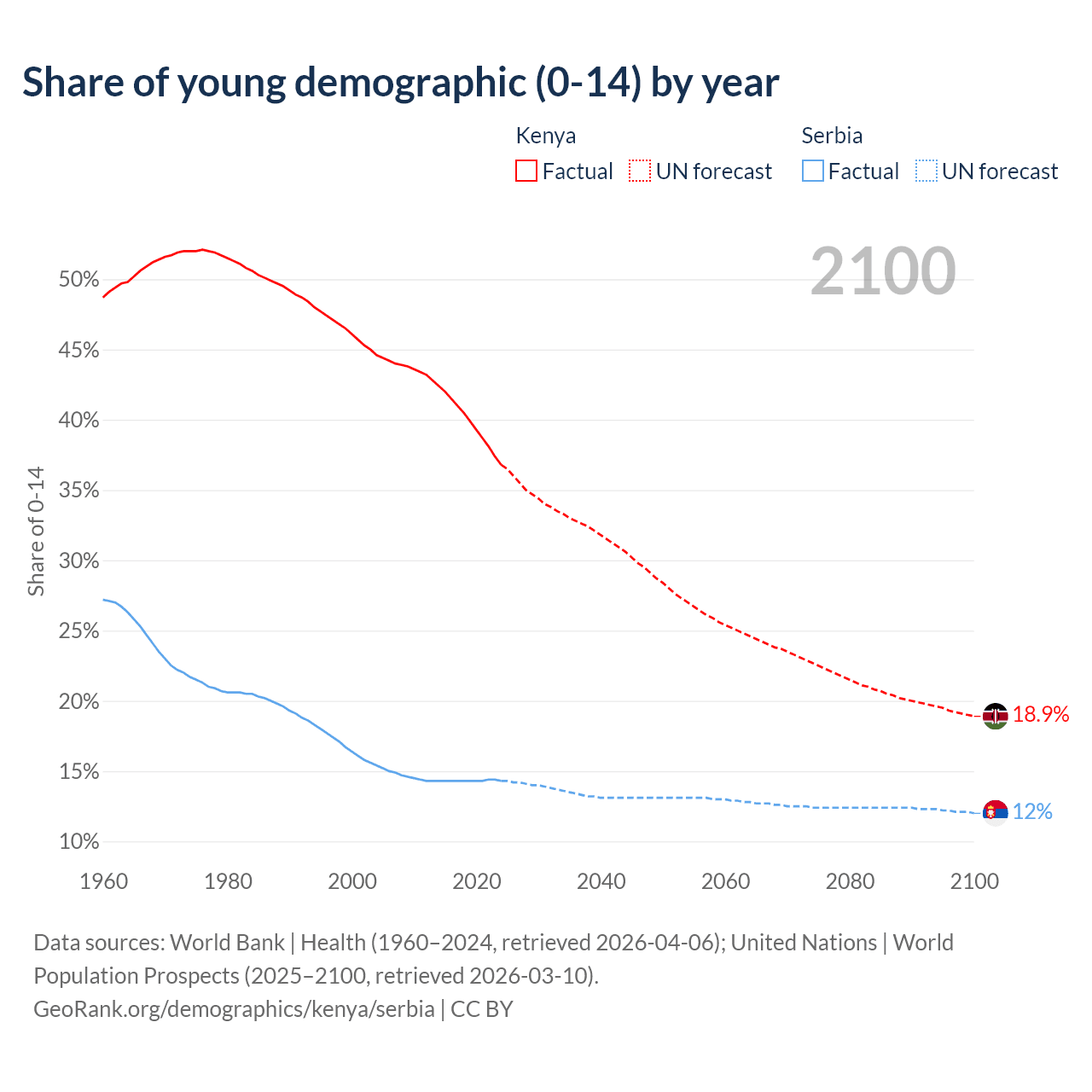 - The share of young demographic (0-15 years old) in Kenya is 36.8% vs 14.3% in Serbia.