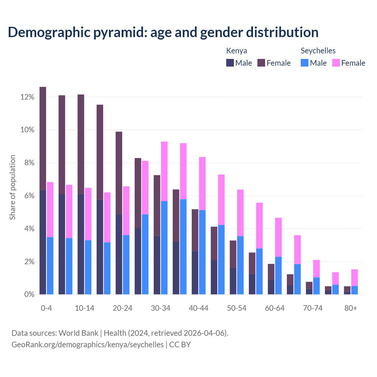 - As of 2026, the population of Kenya is 59M vs 126K in the Seychelles - 467 times difference.
