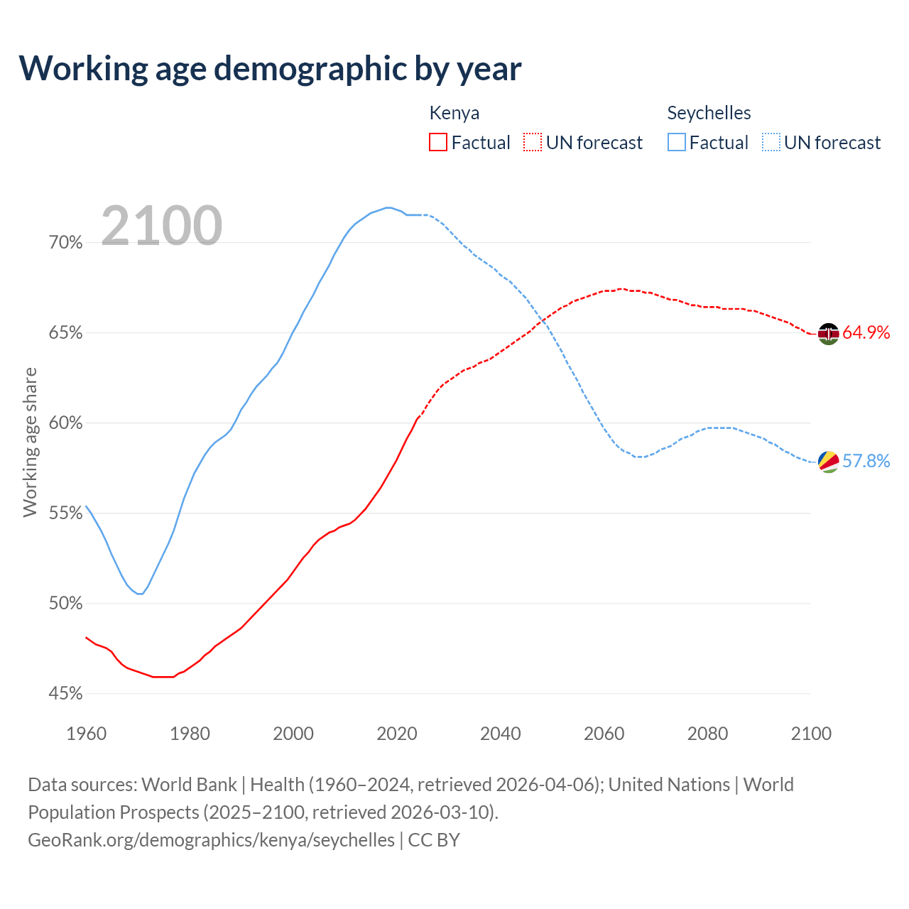 - Kenya has 35.5M working age adults (aged 15-64) vs 90.3K in the Seychelles.