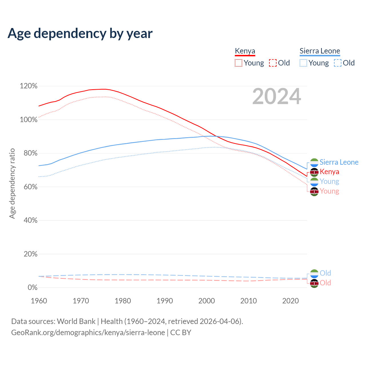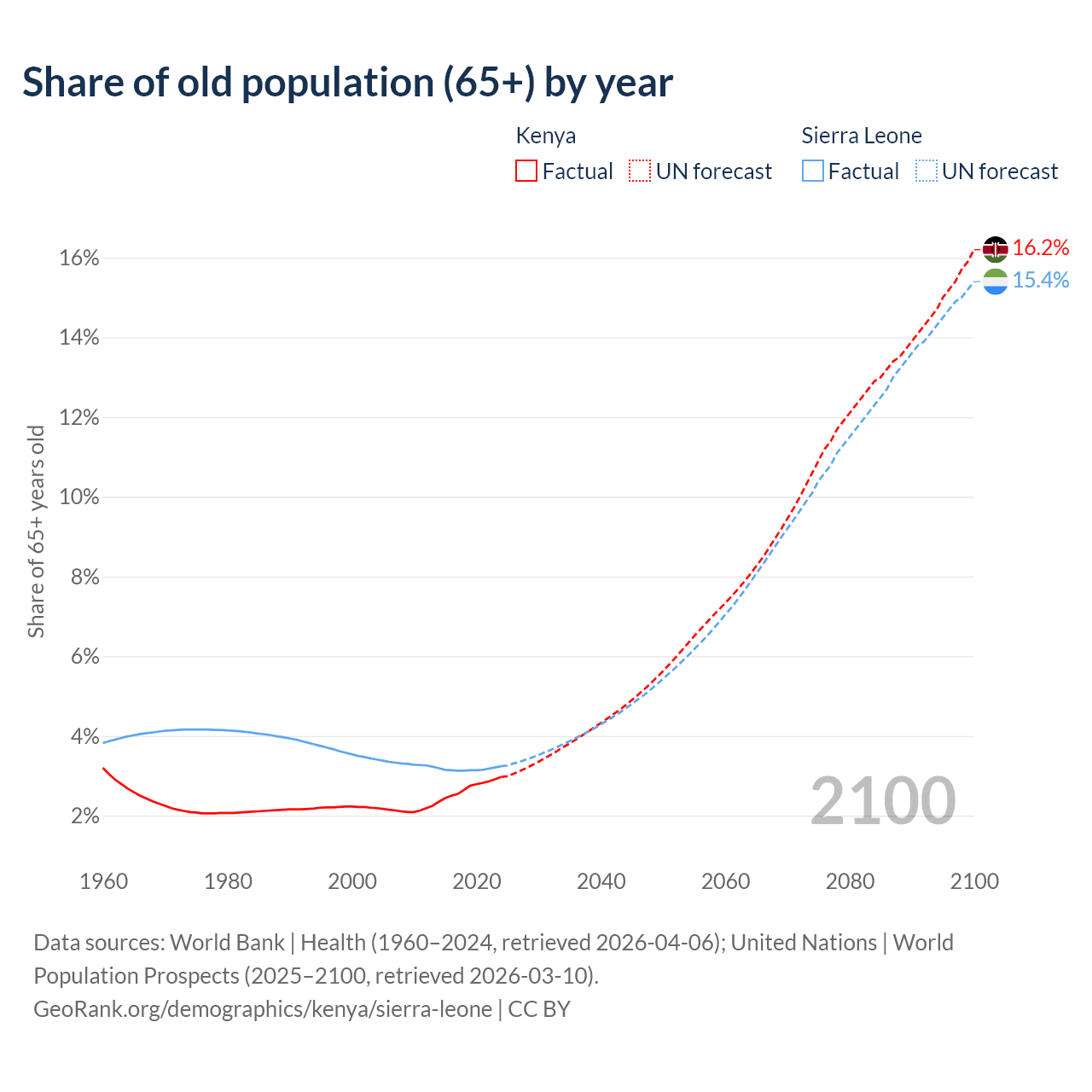 The share of older people aged 65 and over is 2.97% in Kenya and 3.24% in Sierra Leone. Life expectancy in Kenya compared to Sierra Leone .