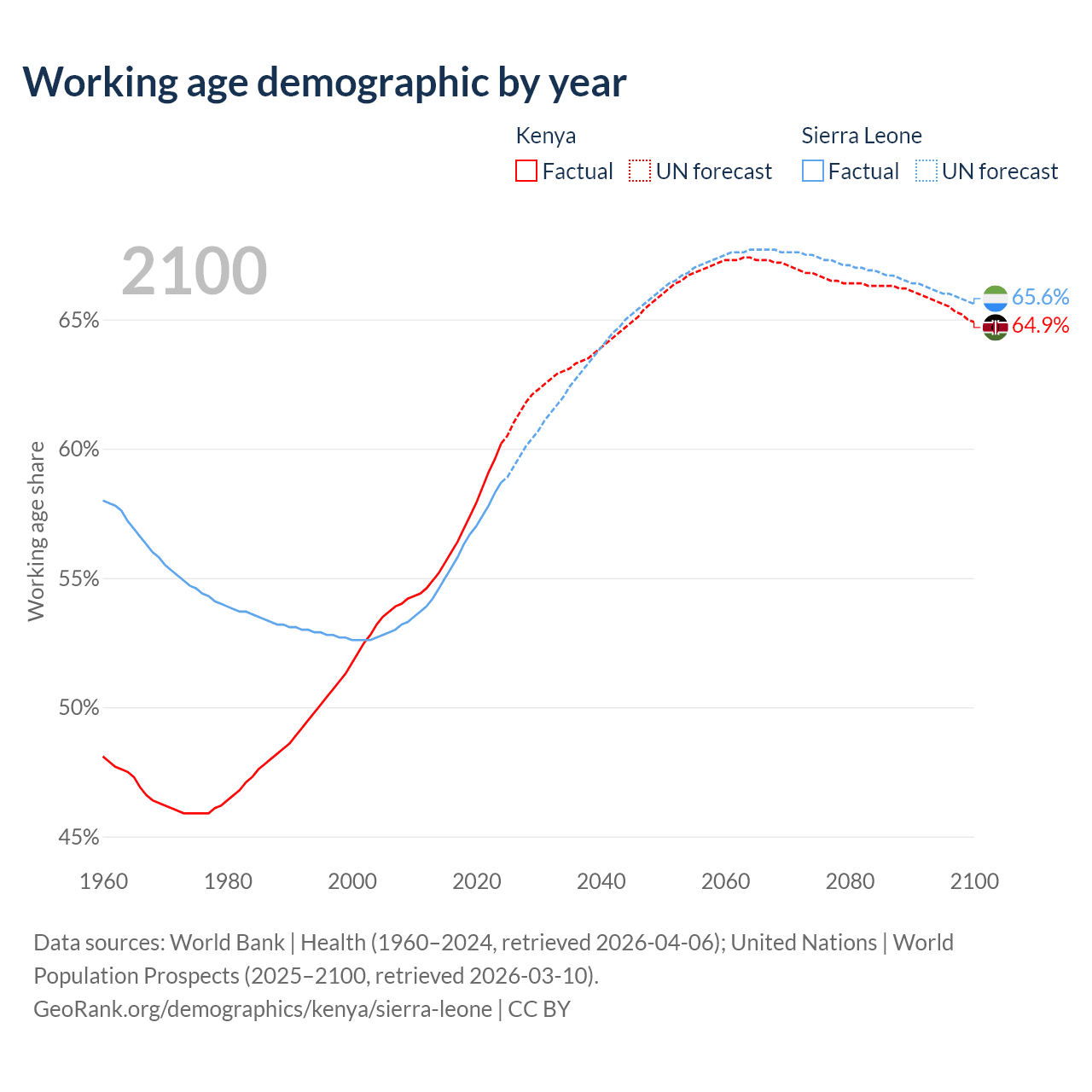 - Kenya has 35.5M working age adults (aged 15-64) vs 5.31M in Sierra Leone.