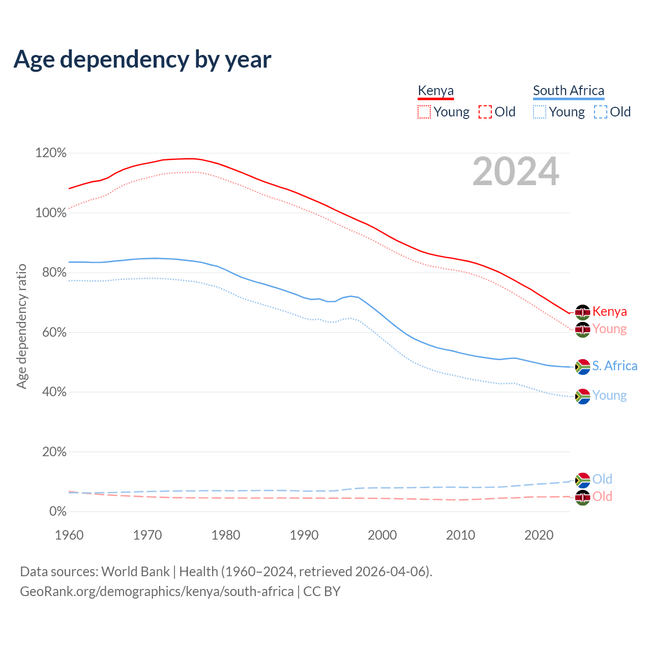 The share of older people aged 65 and over is 2.97% in Kenya and 6.69% in South Africa. Life expectancy in Kenya compared to South Africa .