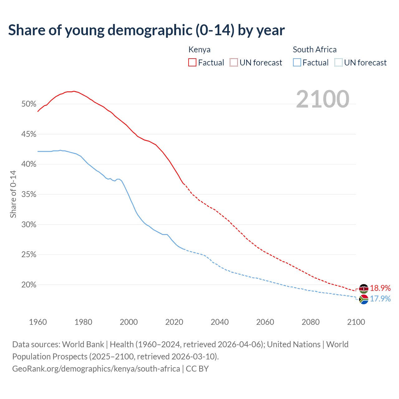 - Kenya is ranked 159/196 by median age (oldest to youngest) vs 107/196 for South Africa.