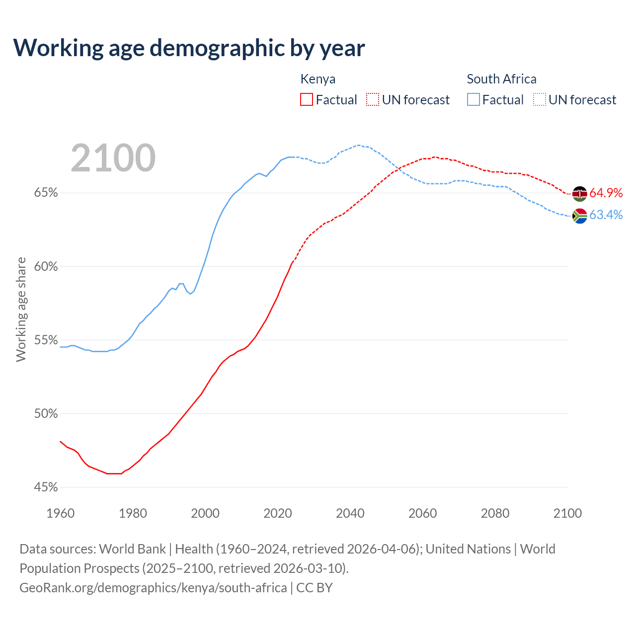 - Kenya has 35.5M working age adults (aged 15-64) vs 44.3M in South Africa.