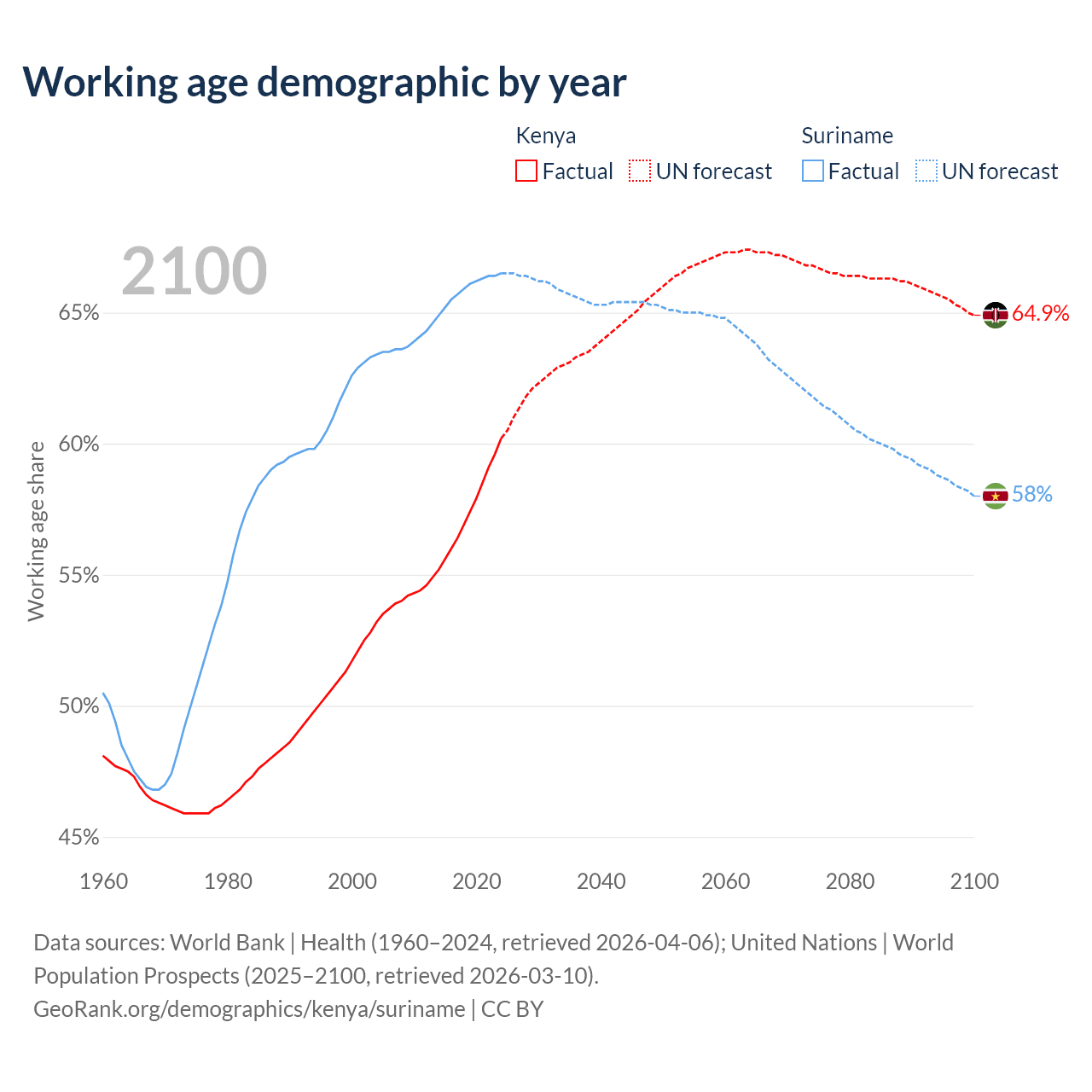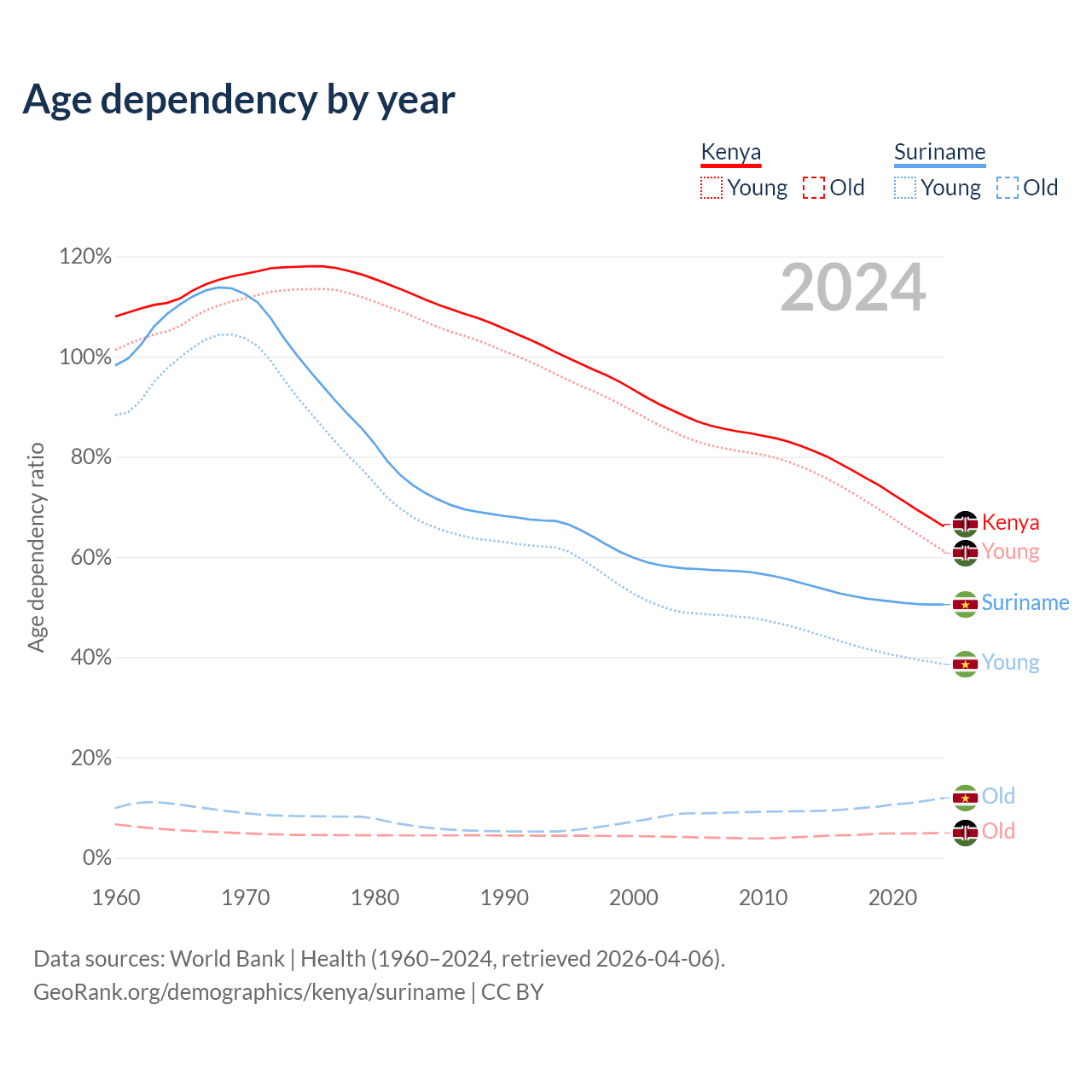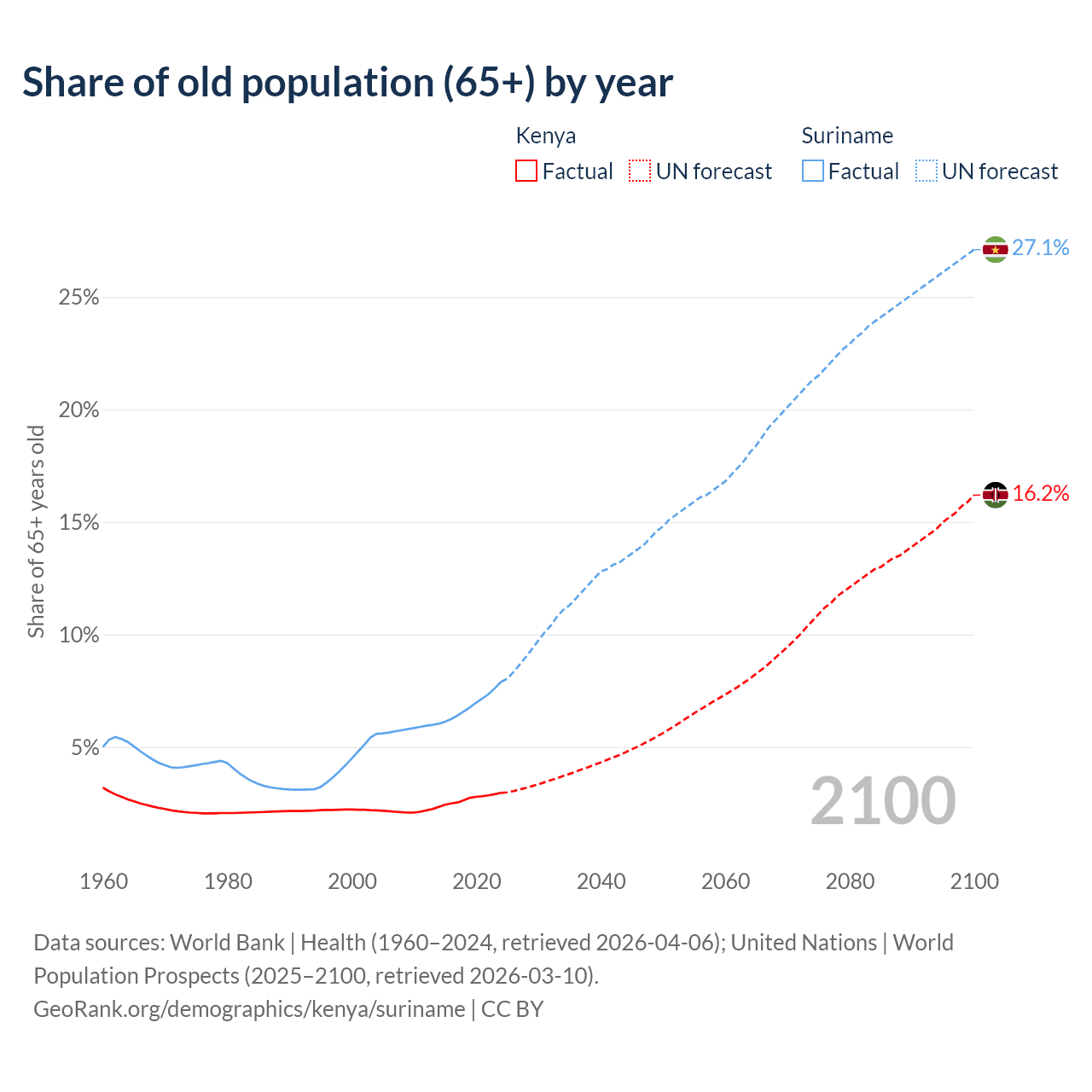 The share of older people aged 65 and over is 2.97% in Kenya and 7.9% in Suriname. Life expectancy in Kenya compared to Suriname .