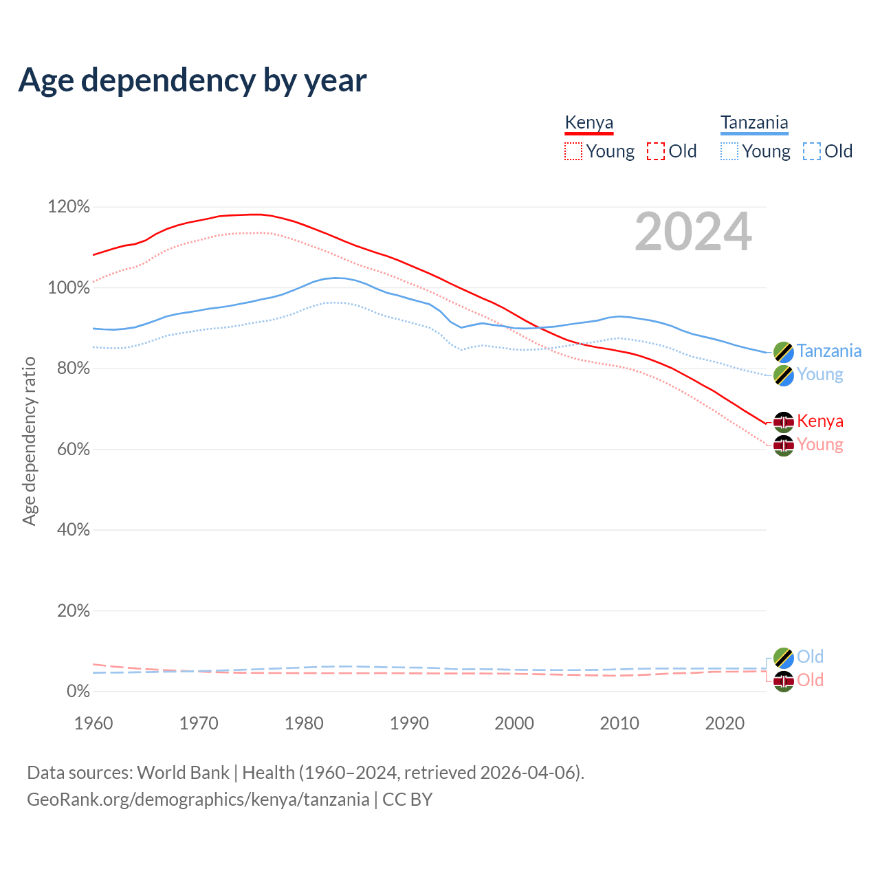 - Kenya is ranked 159/196 by median age (oldest to youngest) vs 184/196 for Tanzania.