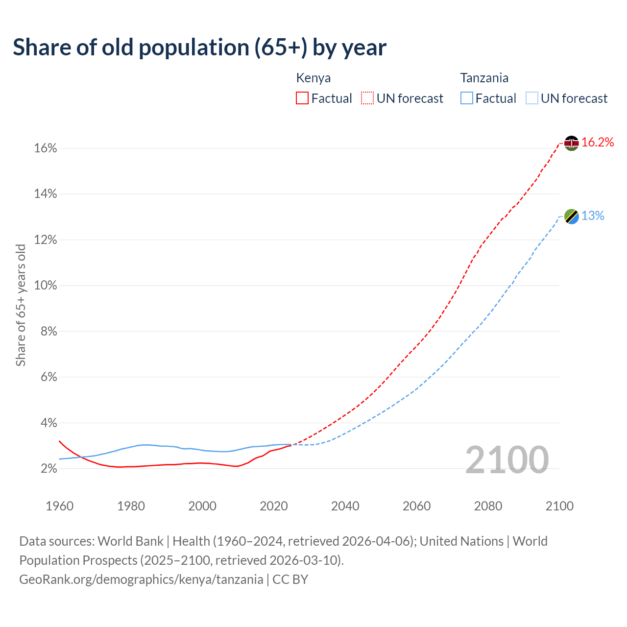 The share of older people aged 65 and over is 2.97% in Kenya and 3.05% in Tanzania. Life expectancy in Kenya compared to Tanzania .