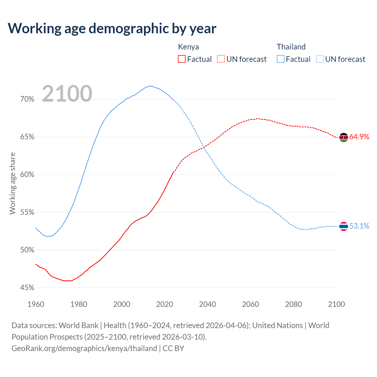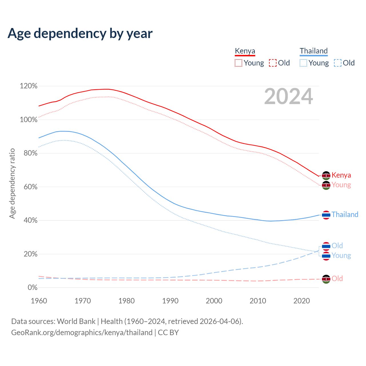 The share of older people aged 65 and over is 2.97% in Kenya and 15.4% in Thailand. Life expectancy in Kenya compared to Thailand .