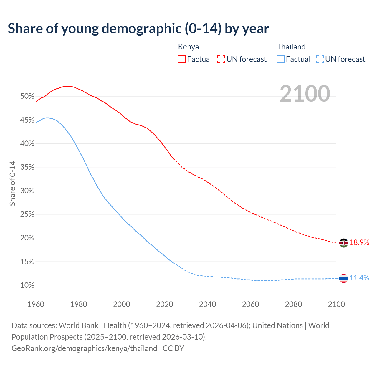 - The share of young demographic (0-15 years old) in Kenya is 36.8% vs 14.7% in Thailand.