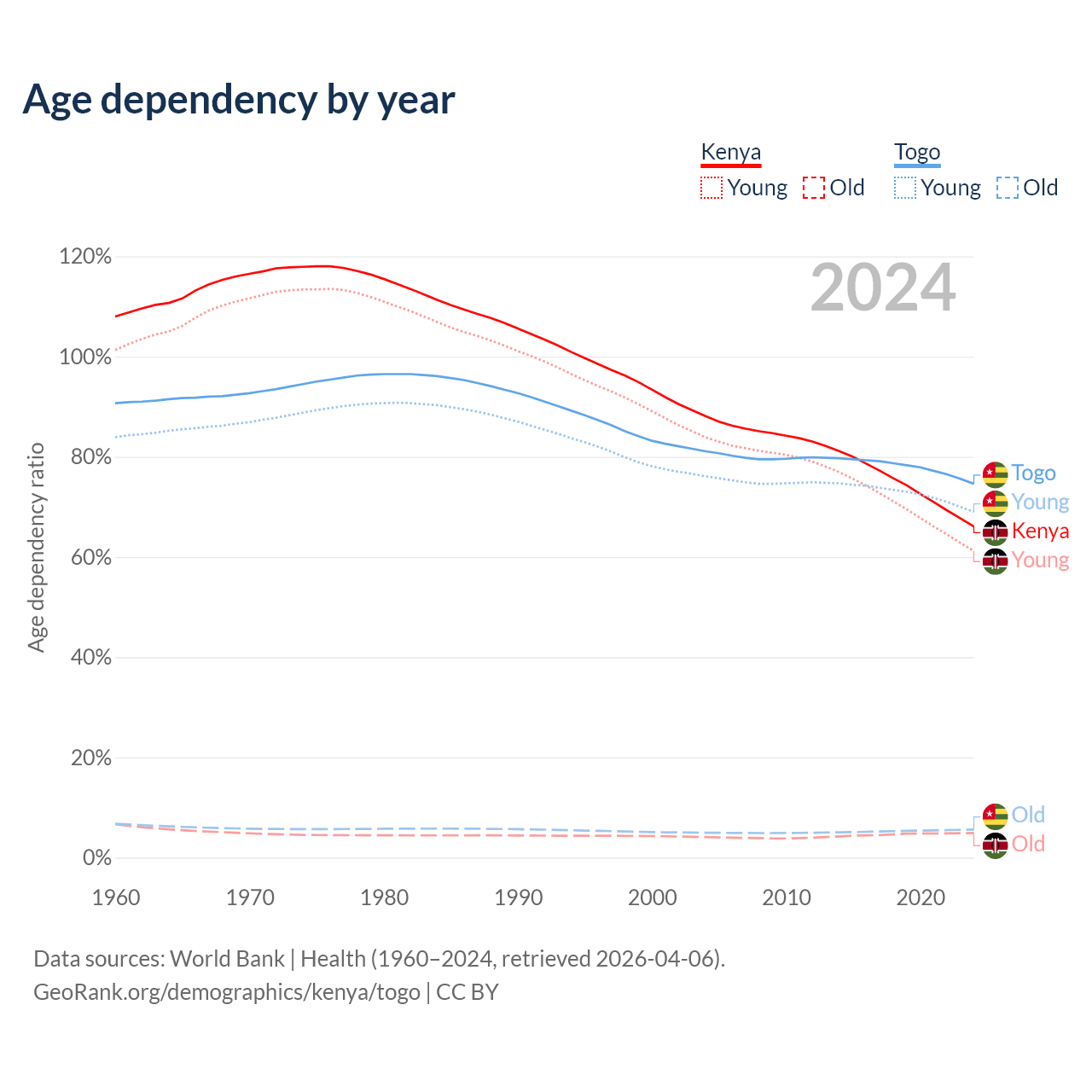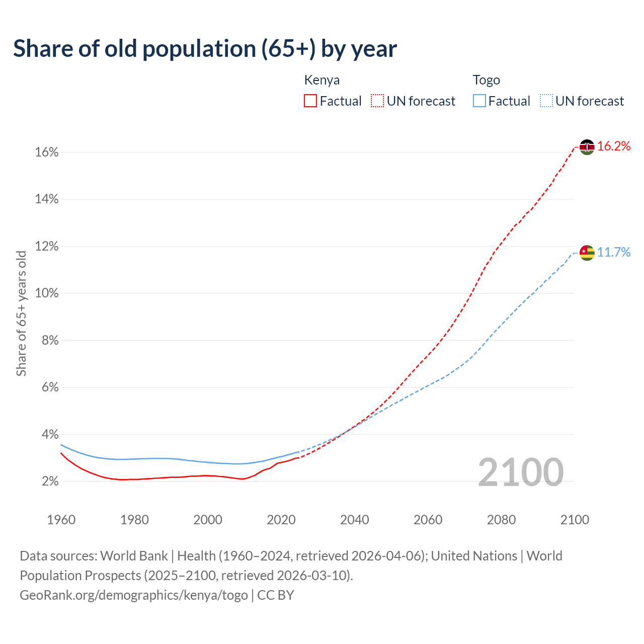 The share of older people aged 65 and over is 2.97% in Kenya and 3.21% in Togo. Life expectancy in Kenya compared to Togo .