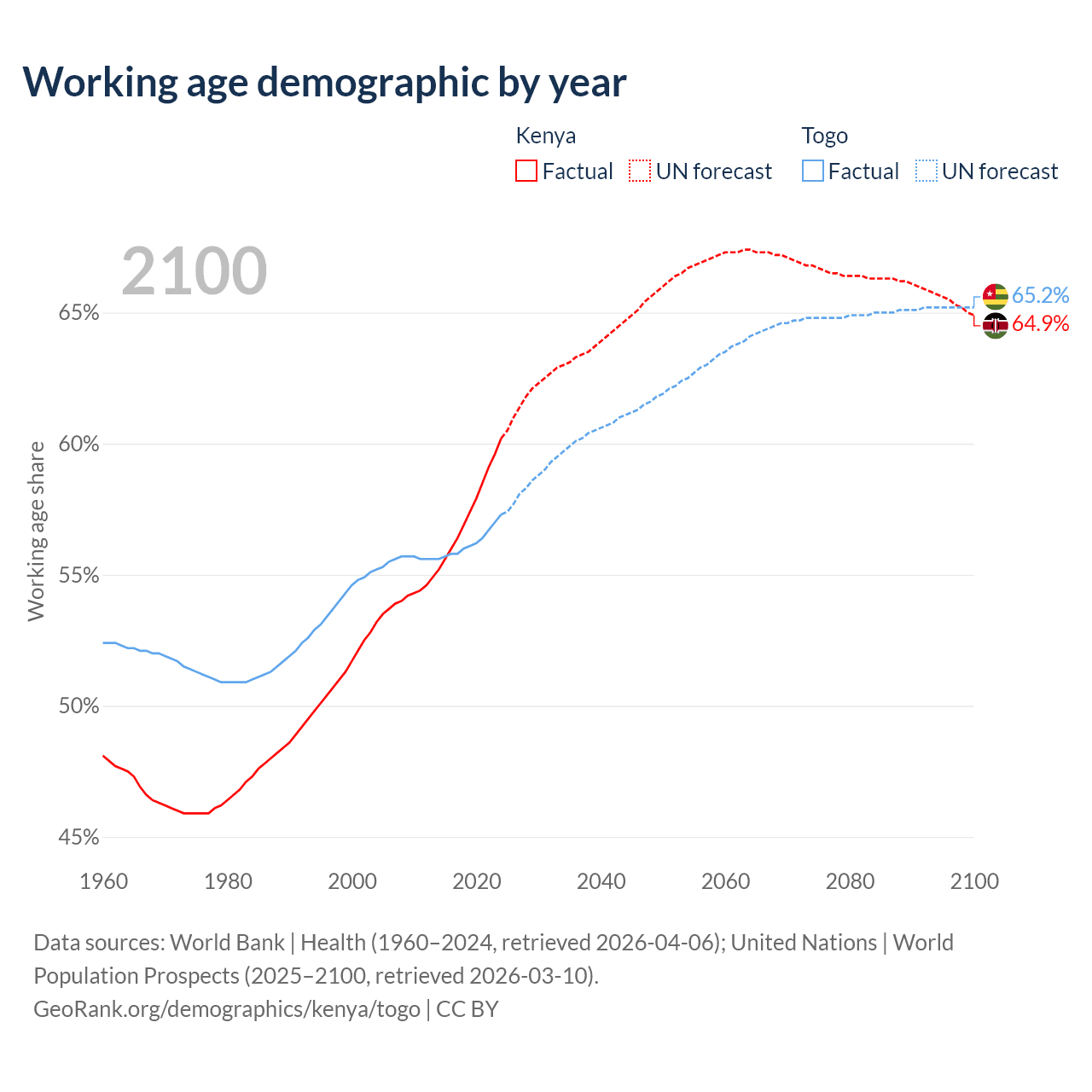 - Kenya has 35.5M working age adults (aged 15-64) vs 5.72M in Togo.