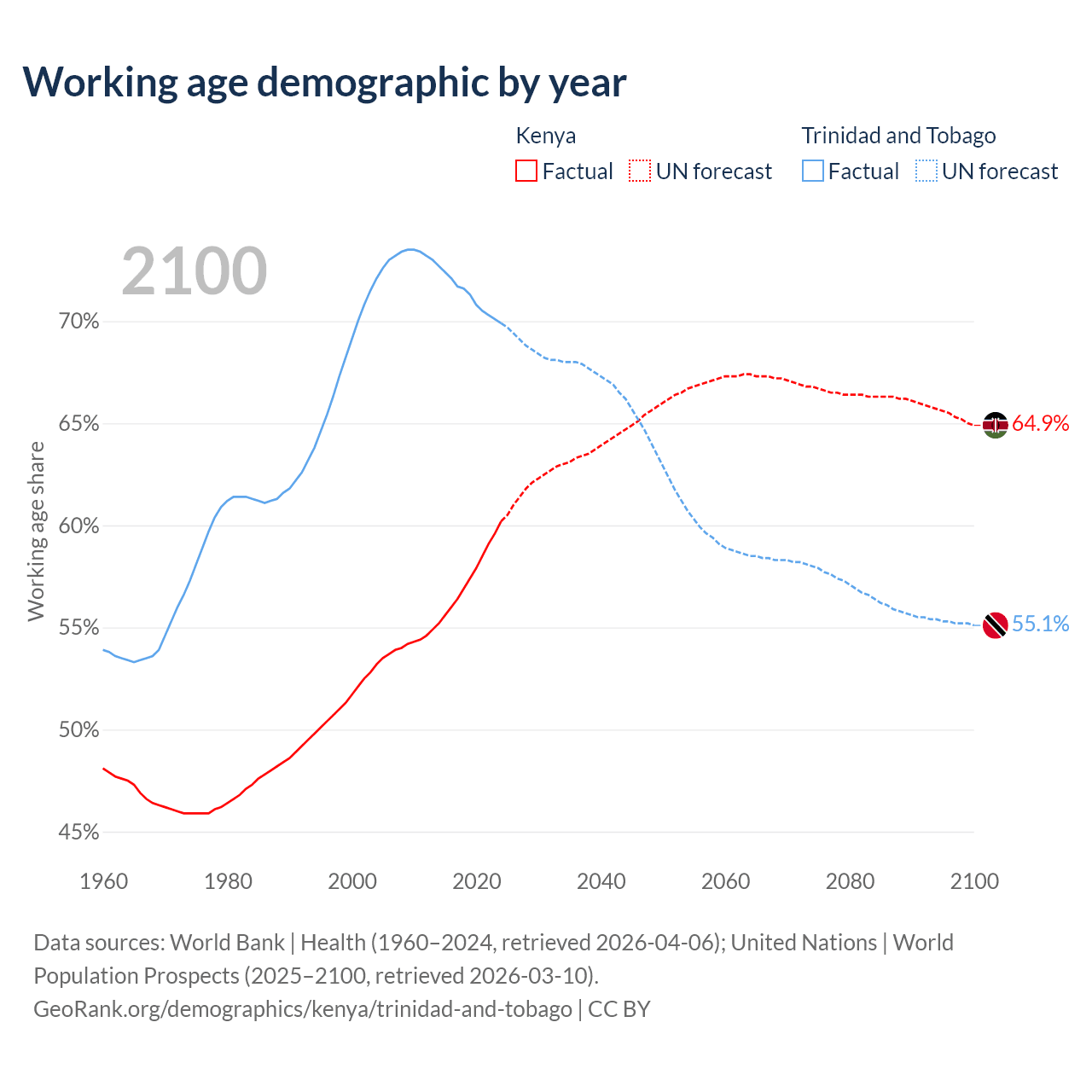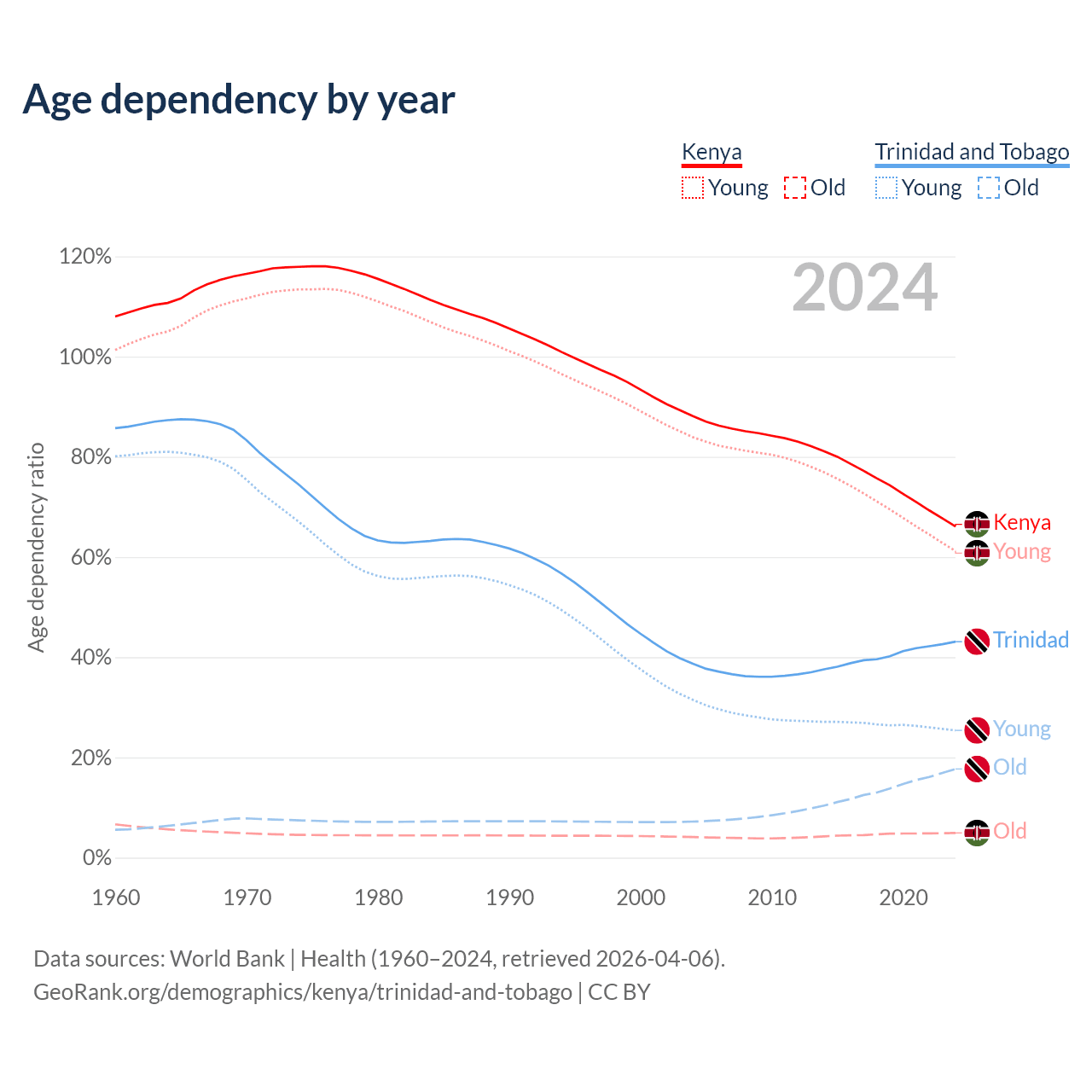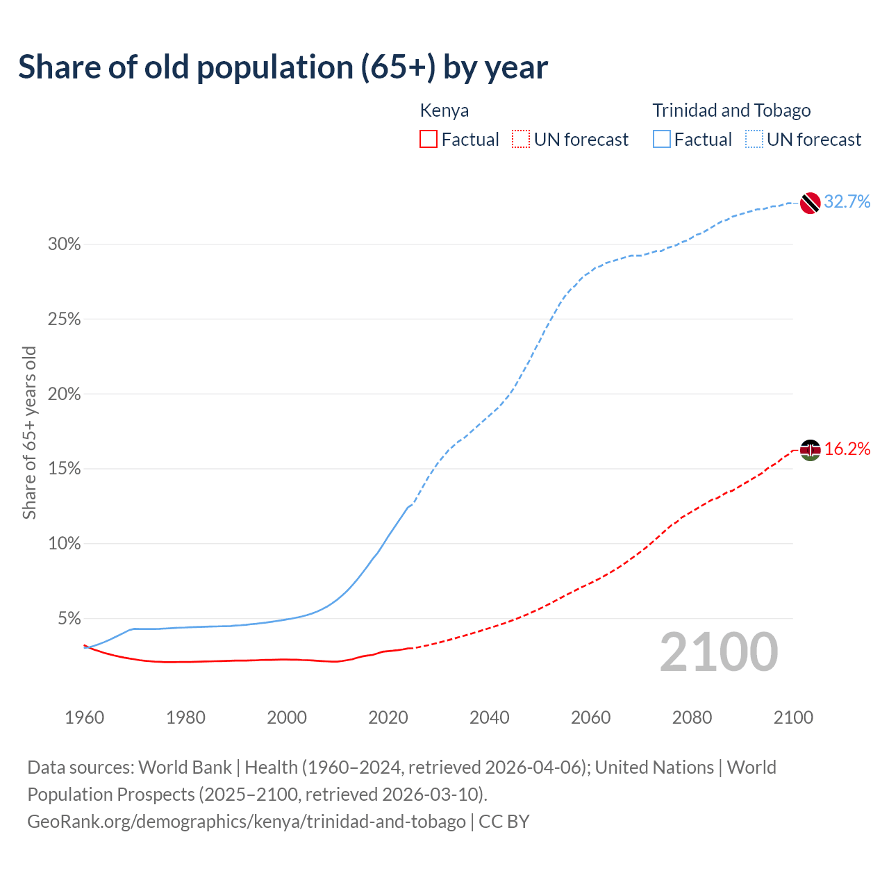 The share of older people aged 65 and over is 2.97% in Kenya and 12.4% in Trinidad and Tobago. Life expectancy in Kenya compared to Trinidad and Tobago .