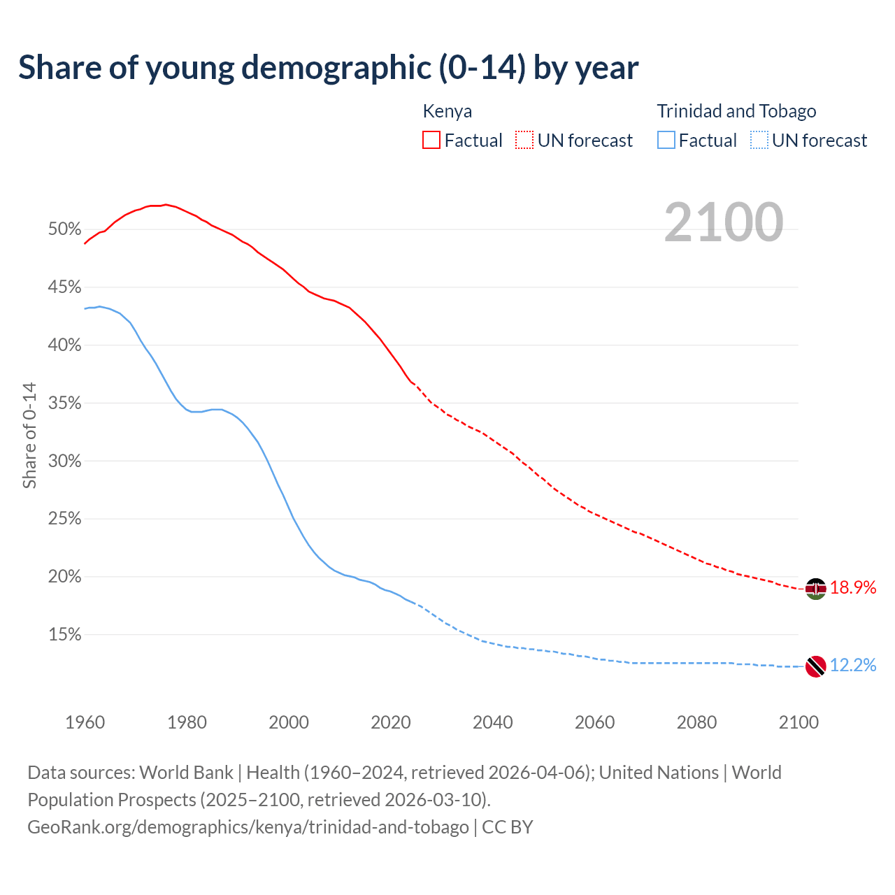 - The share of young demographic (0-15 years old) in Kenya is 36.8% vs 17.8% in Trinidad and Tobago.