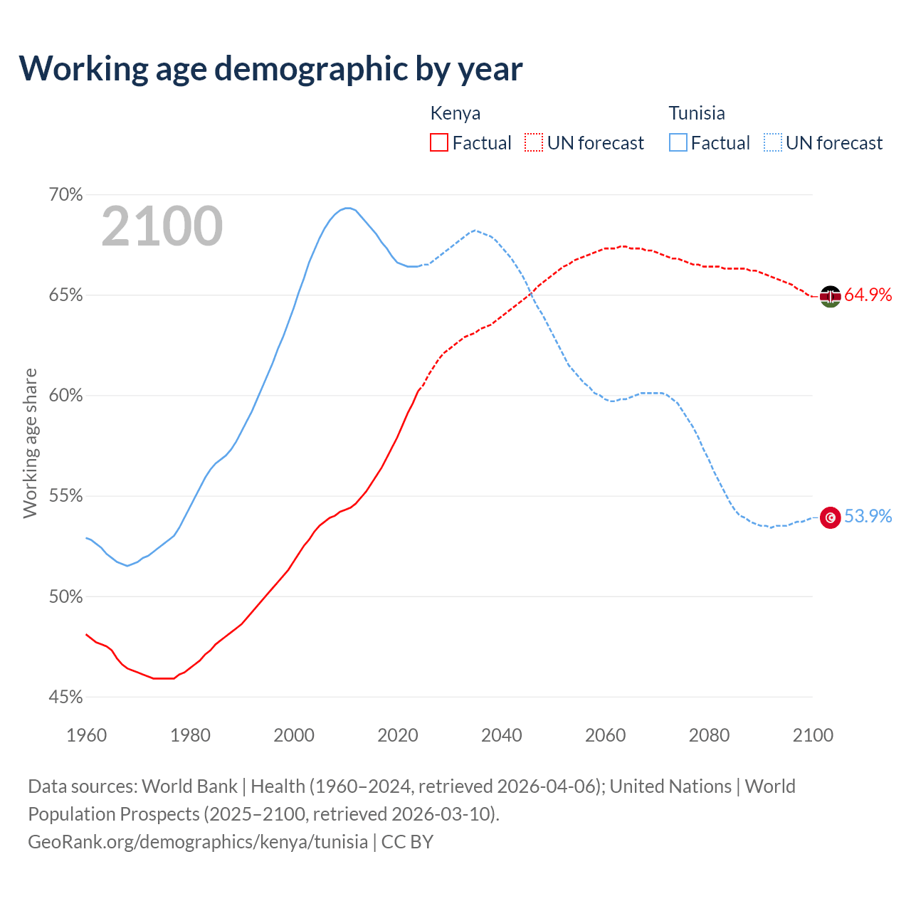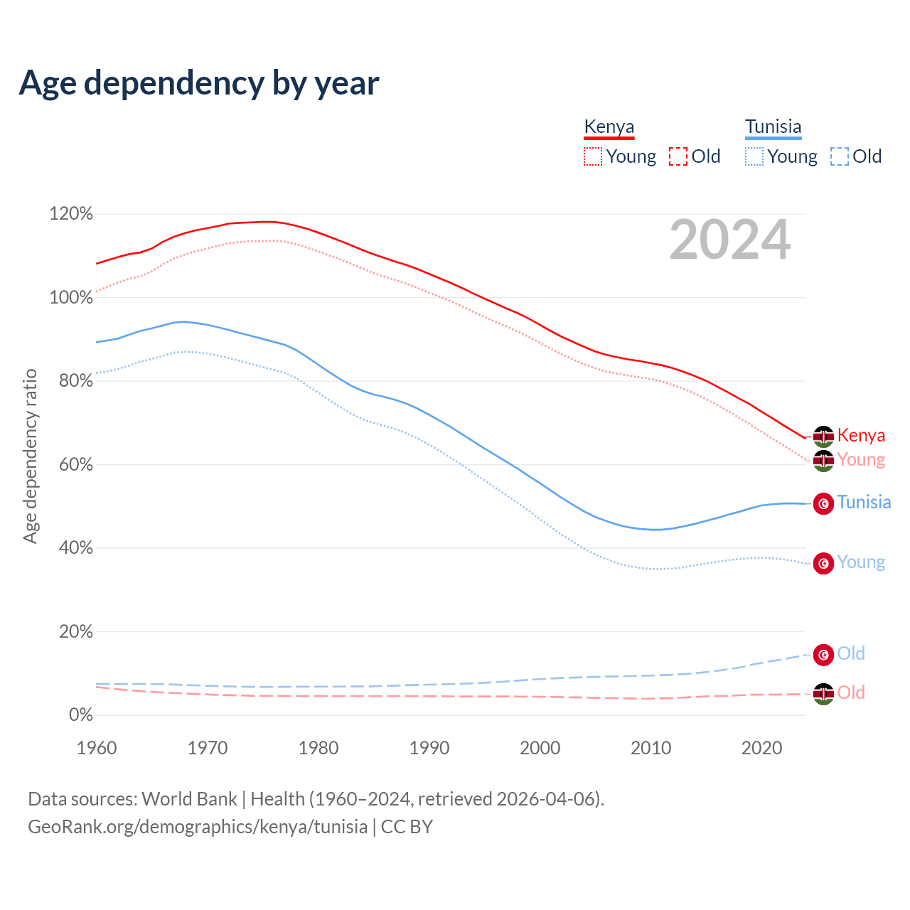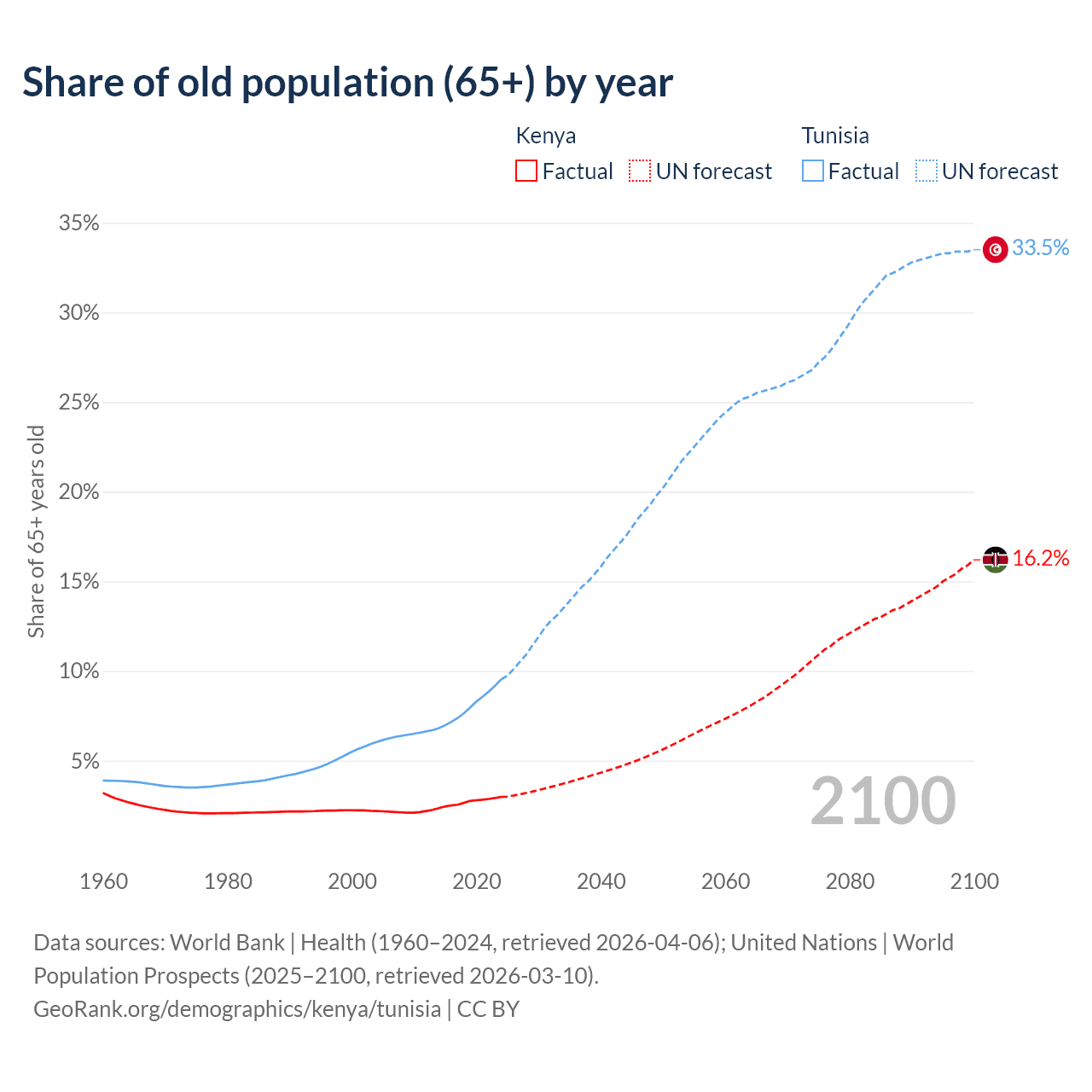 The share of older people aged 65 and over is 2.97% in Kenya and 9.53% in Tunisia. Life expectancy in Kenya compared to Tunisia .