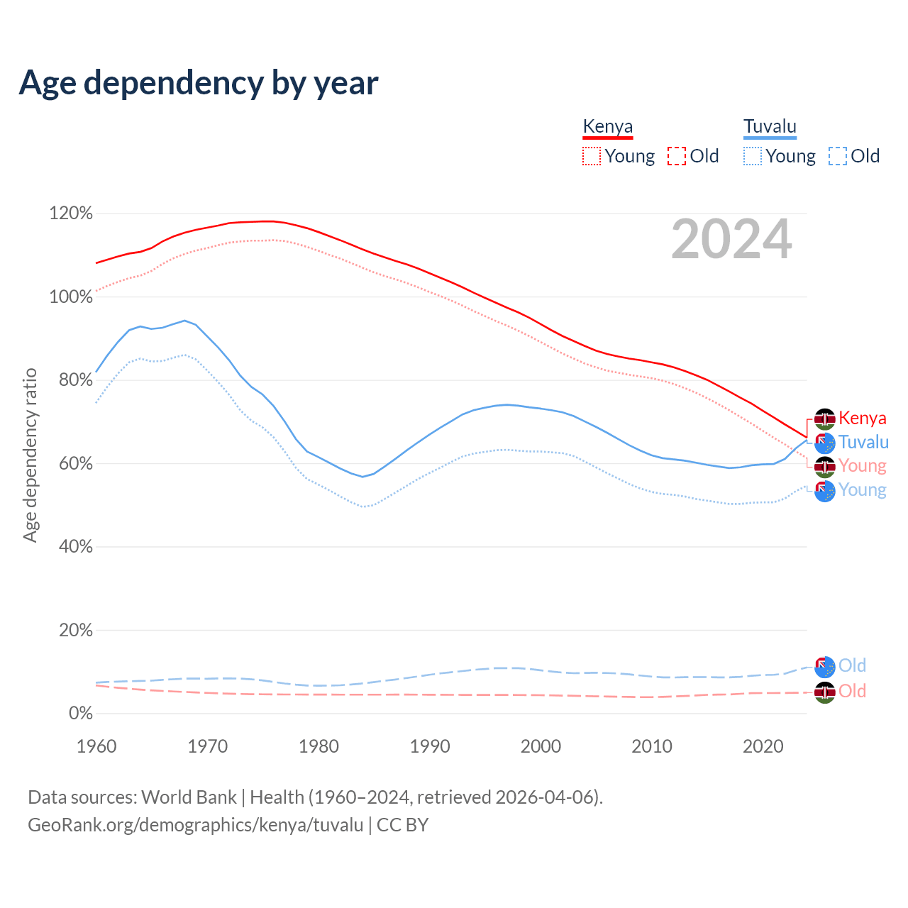 - The share of old-age demographic (65+) in Kenya is 2.97% vs 6.67% in Tuvalu.