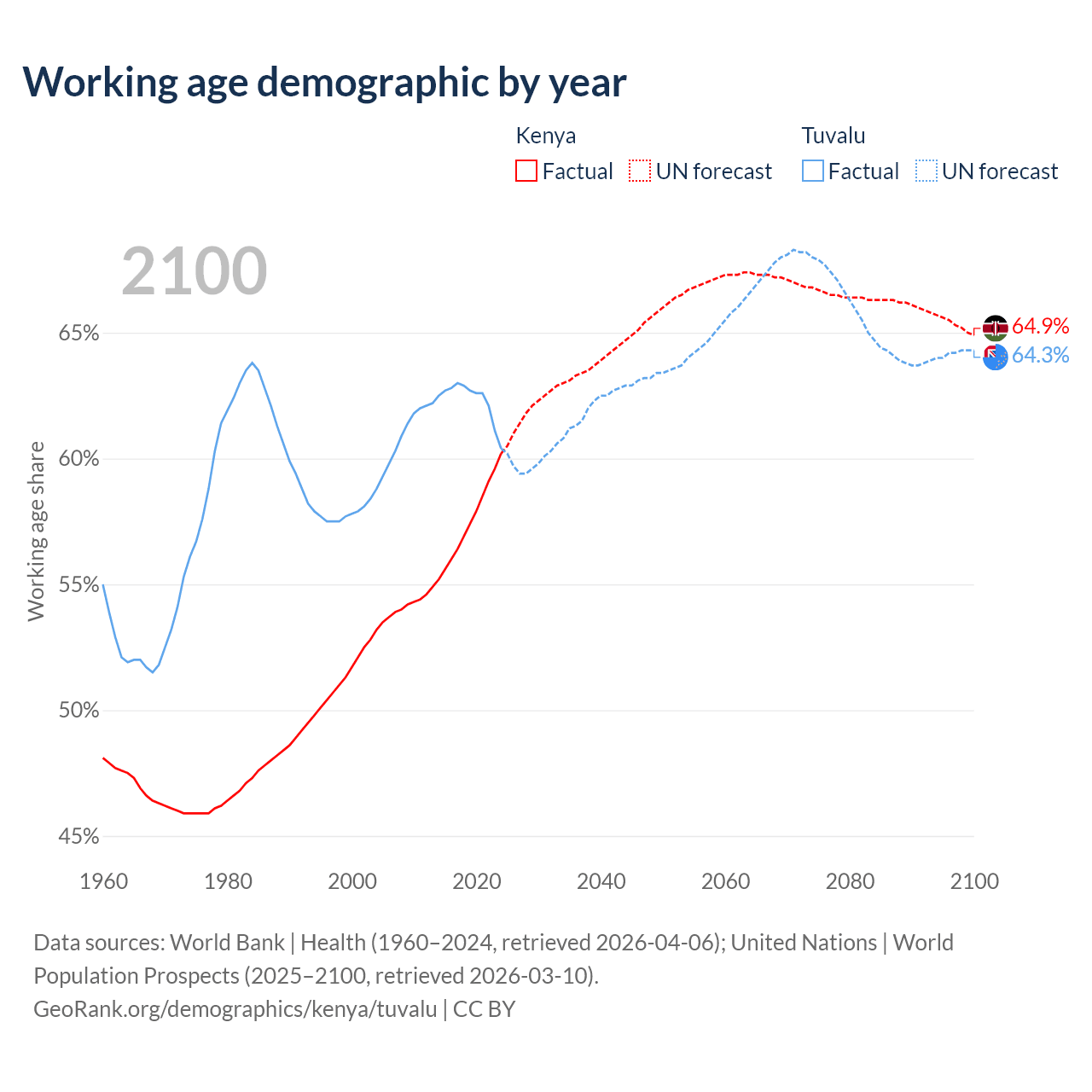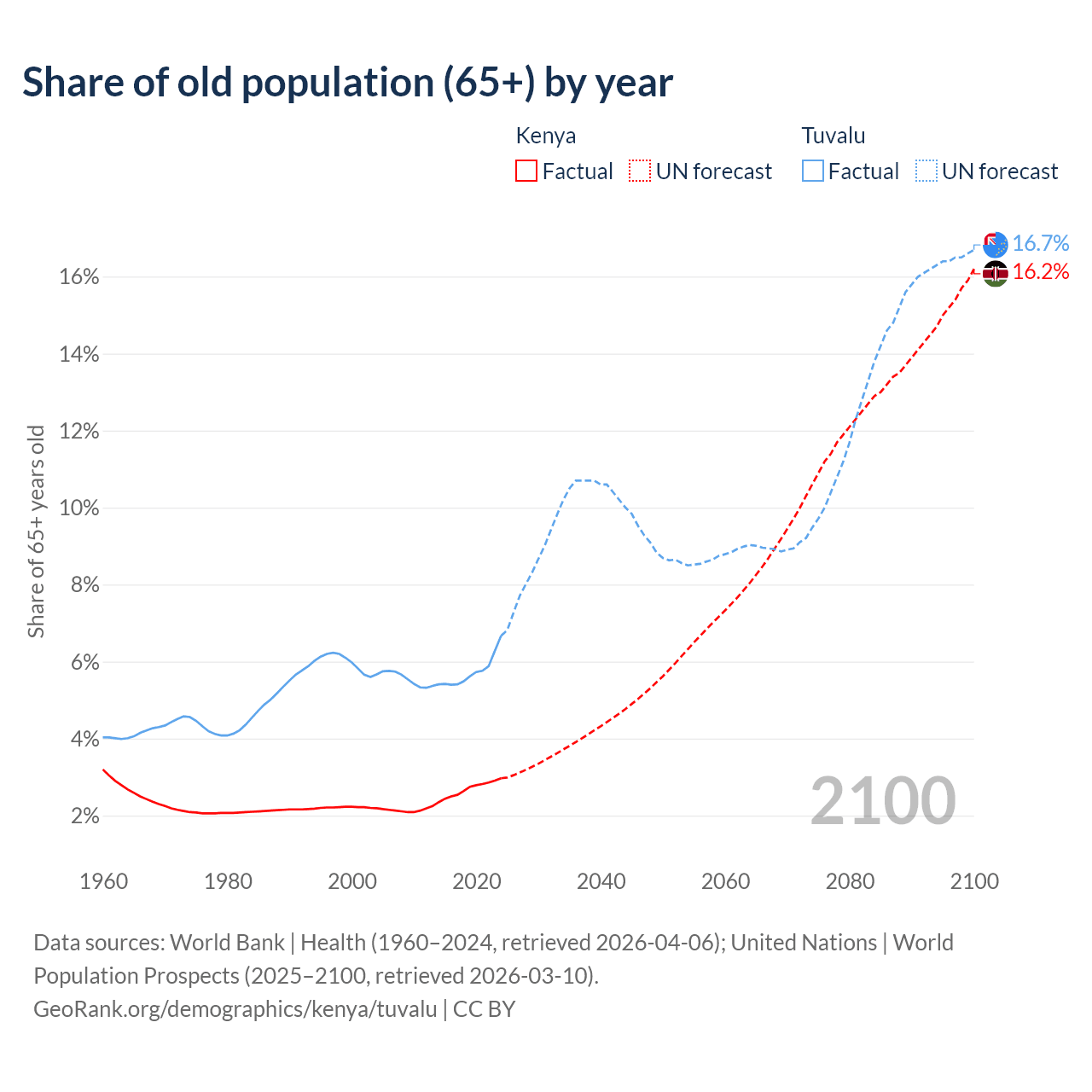 The share of older people aged 65 and over is 2.97% in Kenya and 6.67% in Tuvalu. Life expectancy in Kenya compared to Tuvalu .