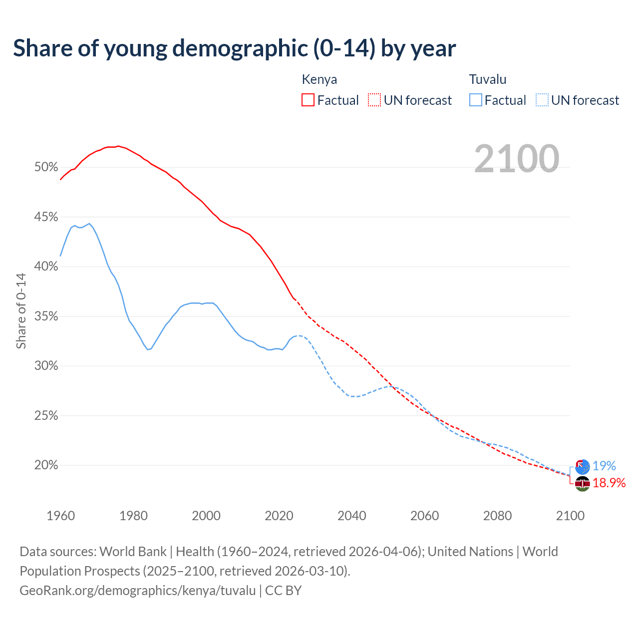 - The share of young demographic (0-15 years old) in Kenya is 36.8% vs 32.9% in Tuvalu.