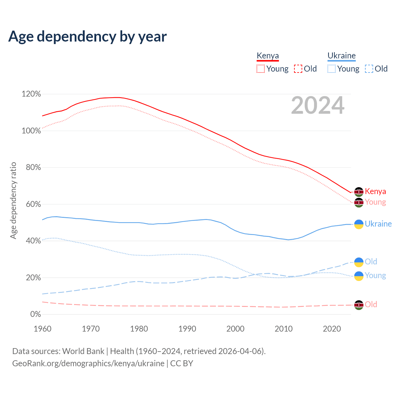 The share of older people aged 65 and over is 2.97% in Kenya and 19% in Ukraine. Life expectancy in Kenya compared to Ukraine .