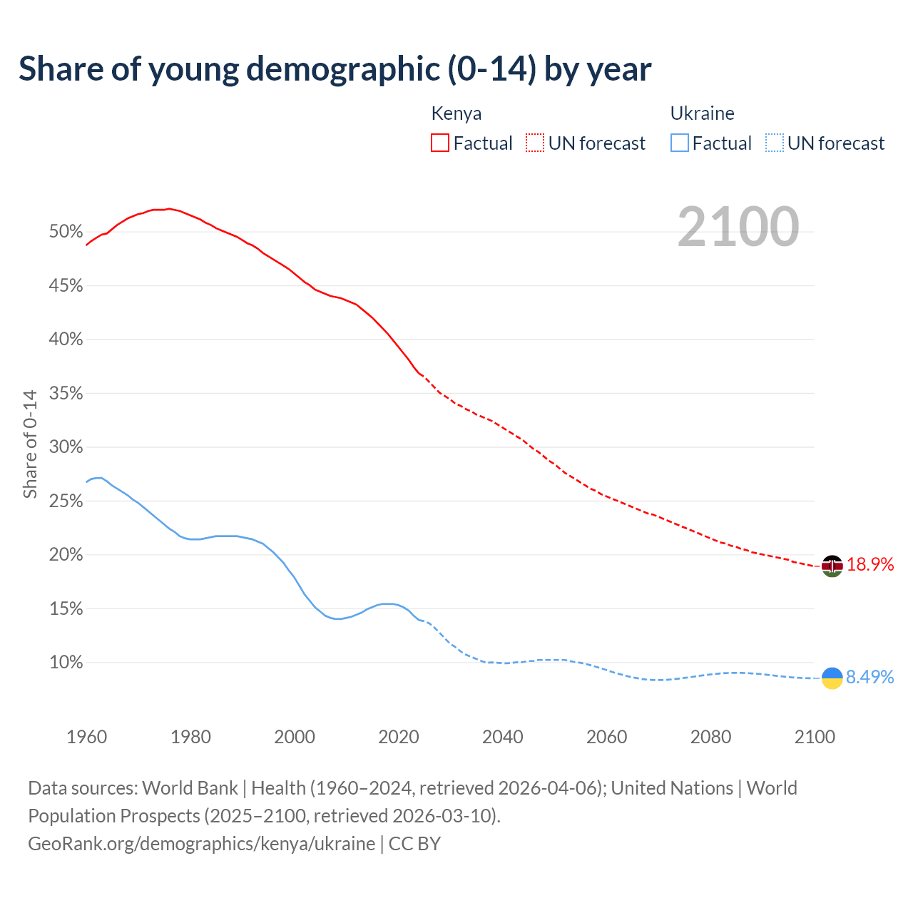 - The share of young demographic (0-15 years old) in Kenya is 36.8% vs 13.9% in Ukraine.