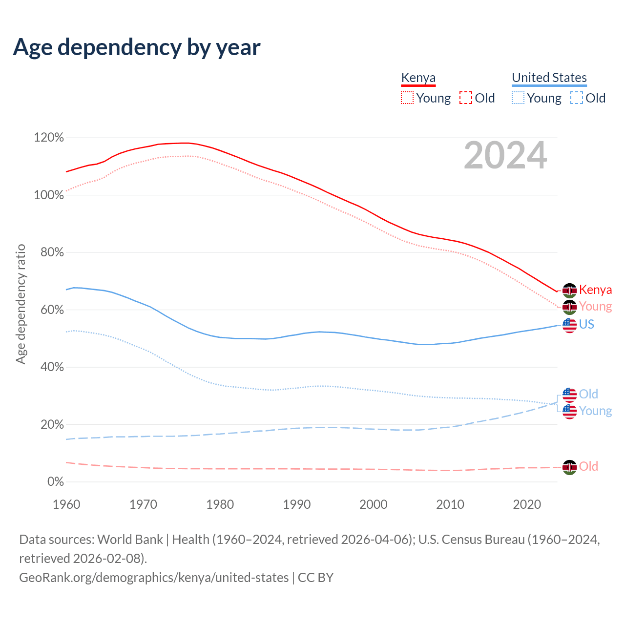 The share of older people aged 65 and over is 2.97% in Kenya and 17.9% in the United States. Life expectancy in Kenya compared to the United States .