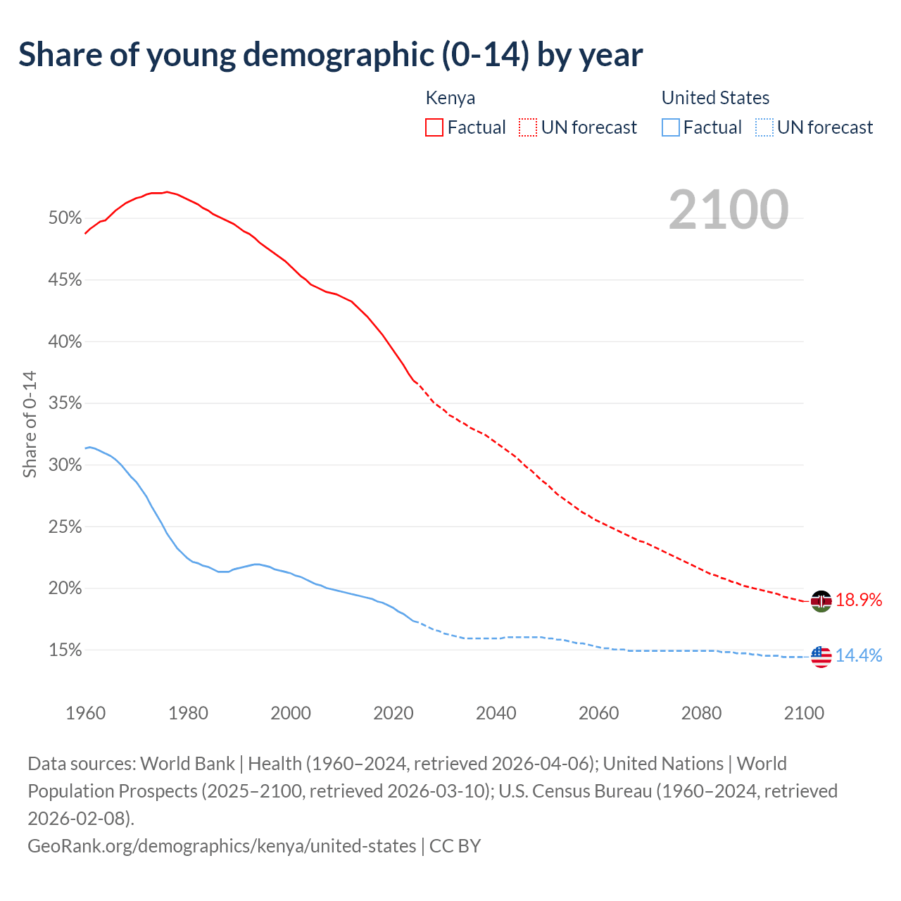 - The share of young demographic (0-15 years old) in Kenya is 36.8% vs 17.3% in the United States.
