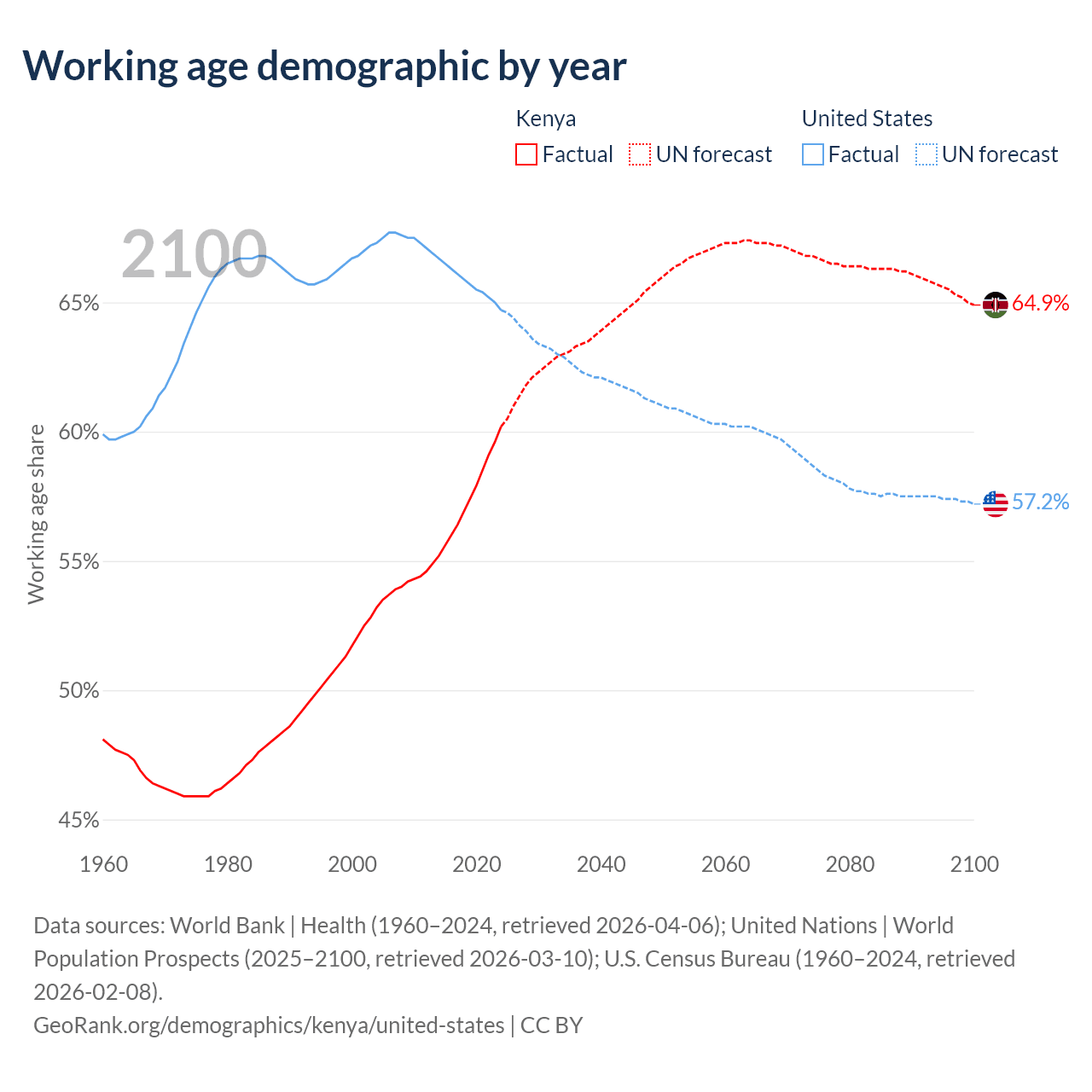 - Kenya has 35.5M working age adults (aged 15-64) vs 223M in the United States.