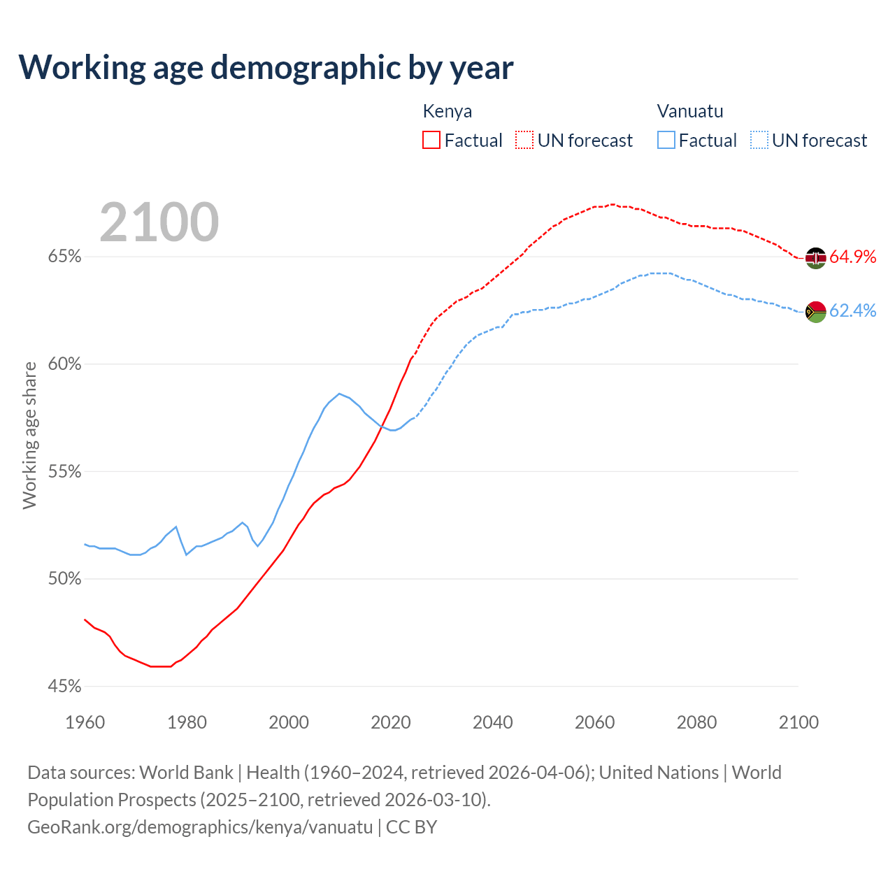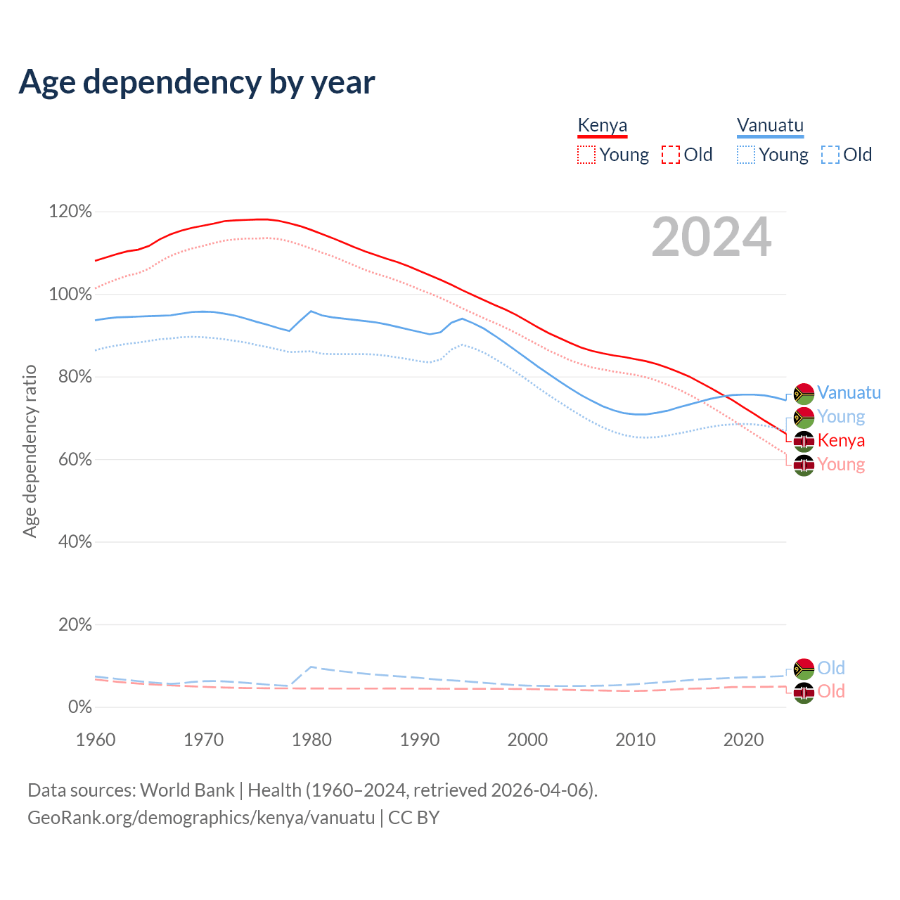 The share of older people aged 65 and over is 2.97% in Kenya and 4.3% in Vanuatu. Life expectancy in Kenya compared to Vanuatu .