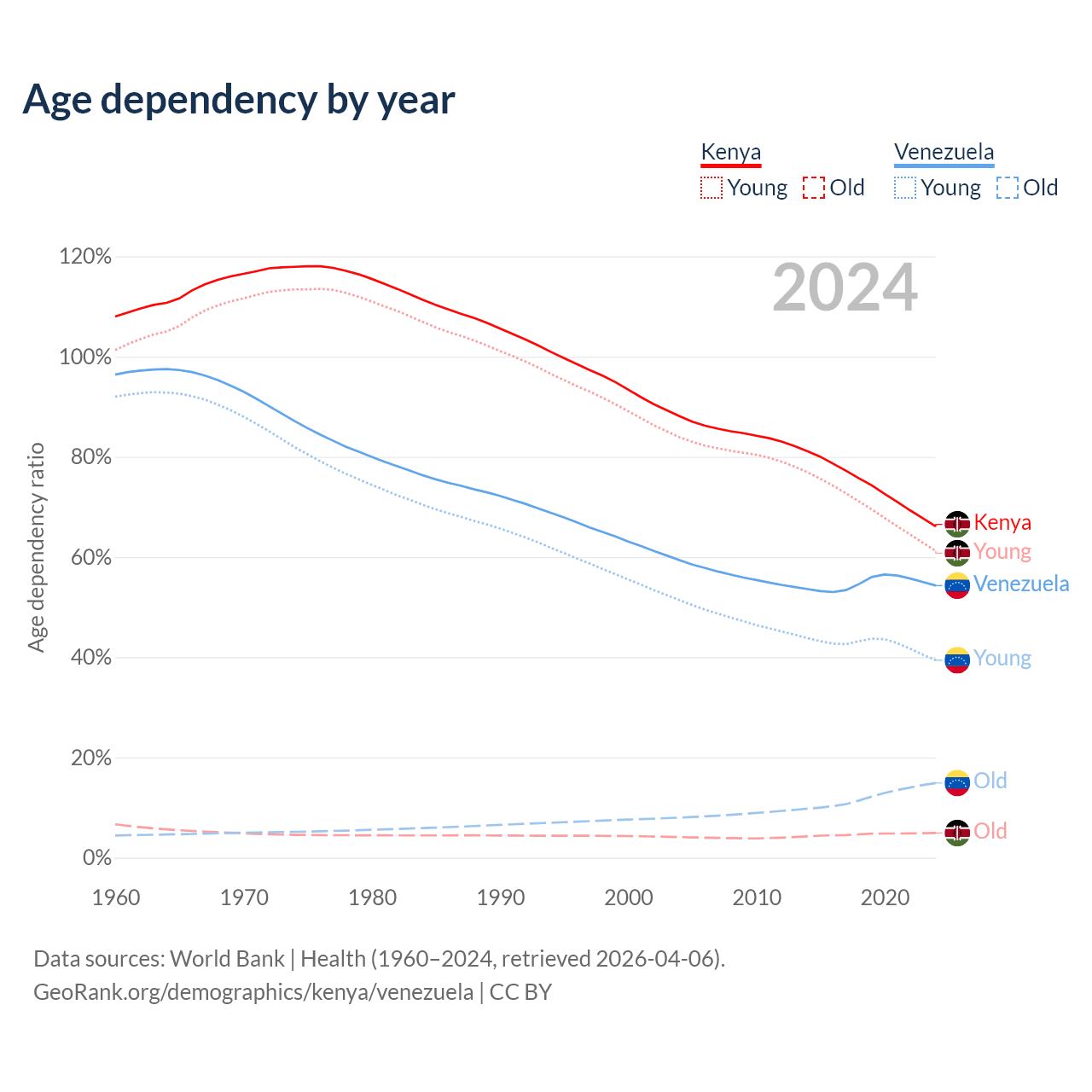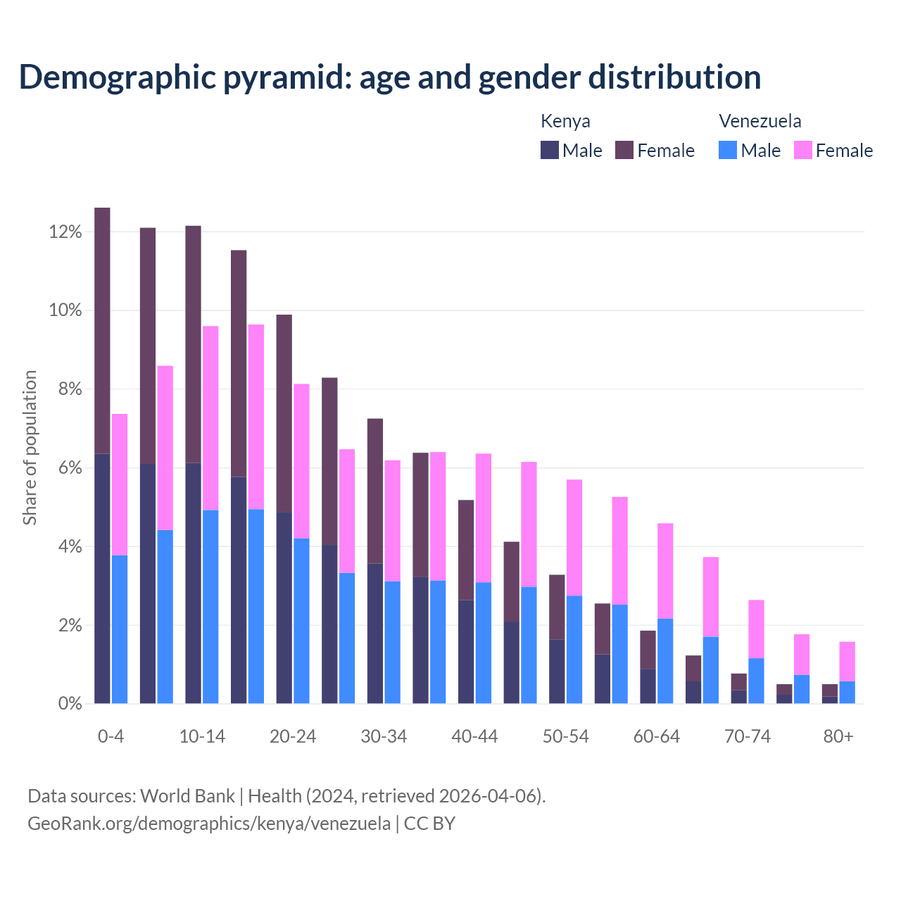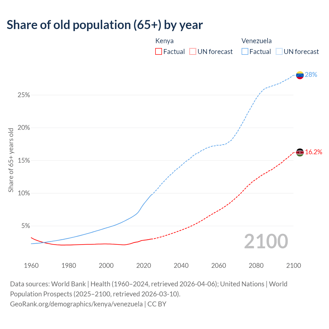The share of older people aged 65 and over is 2.97% in Kenya and 9.68% in Venezuela. Life expectancy in Kenya compared to Venezuela .