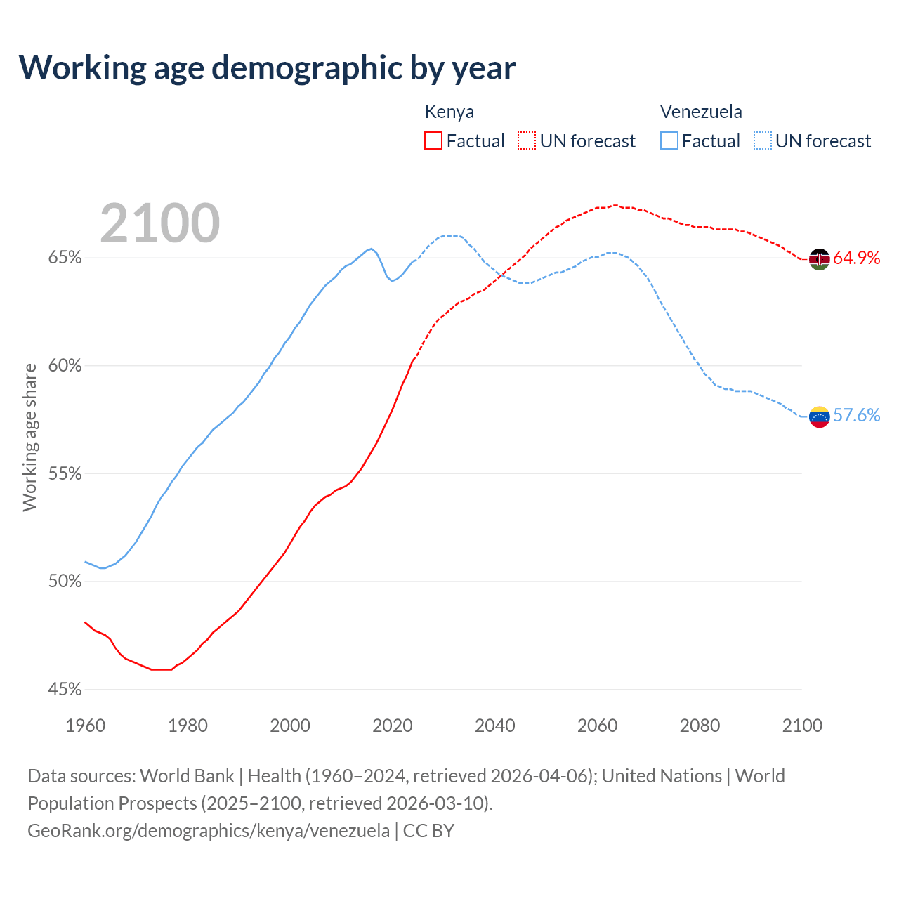 - Kenya has 35.5M working age adults (aged 15-64) vs 18.6M in Venezuela.