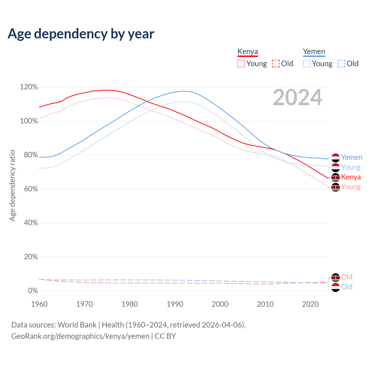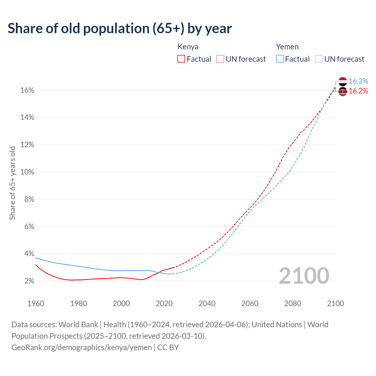 - The share of old-age demographic (65+) in Kenya is 2.97% vs 2.52% in Yemen.