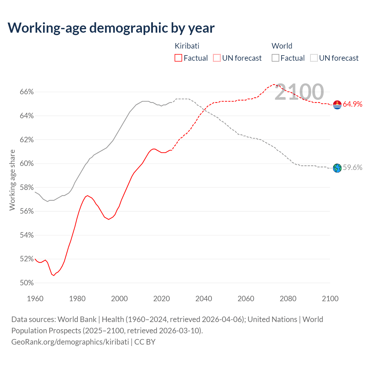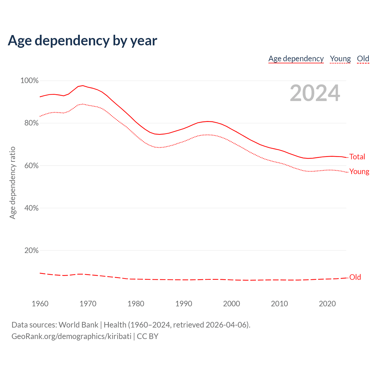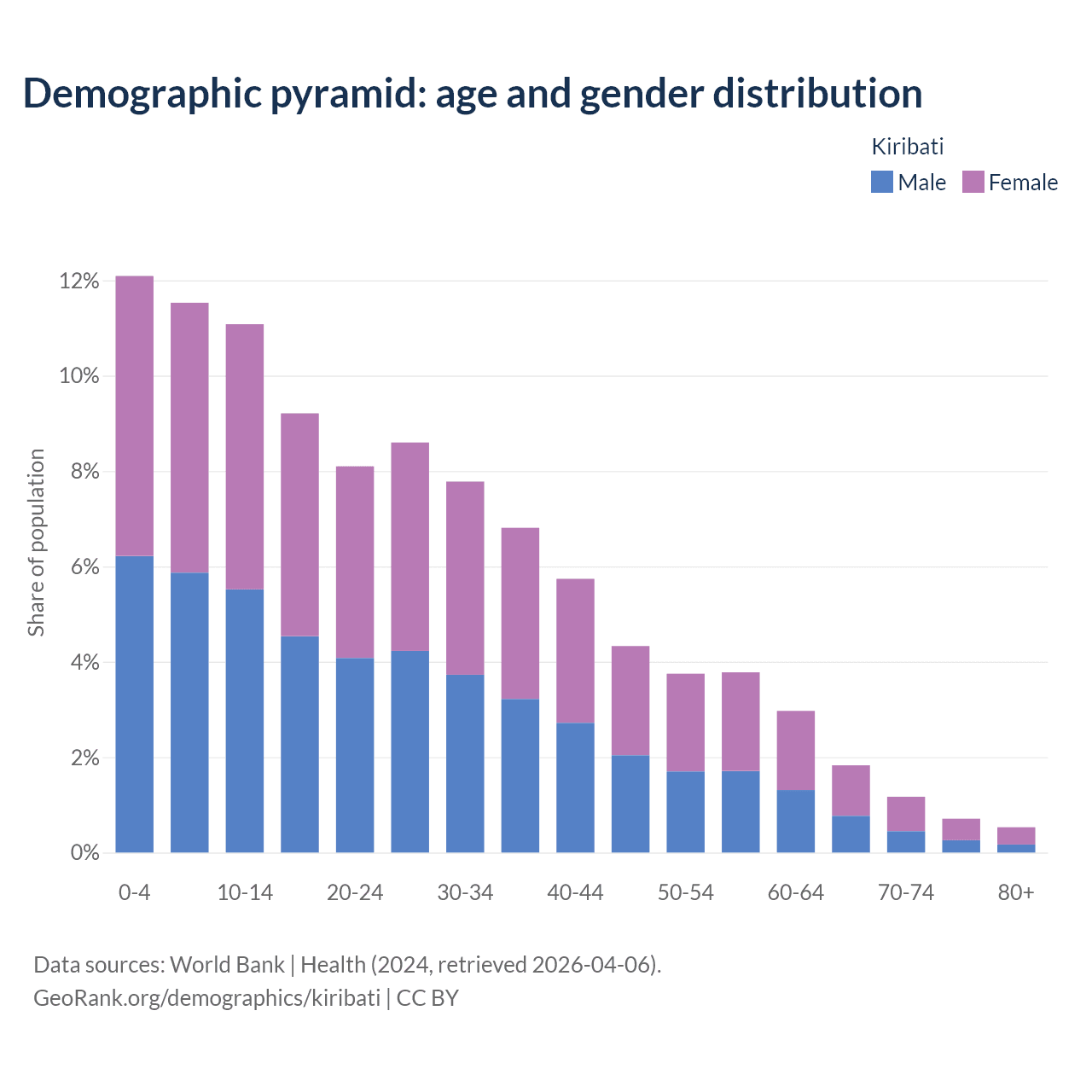 With a population of 135K people, Kiribati has a median age of 23.8 years which makes it the 139/196 oldest country. 34.7% of the demographic are children 0-14 years old, 61.1% are working-age people aged 15-64, and 4.24% are older population aged 65+ years.