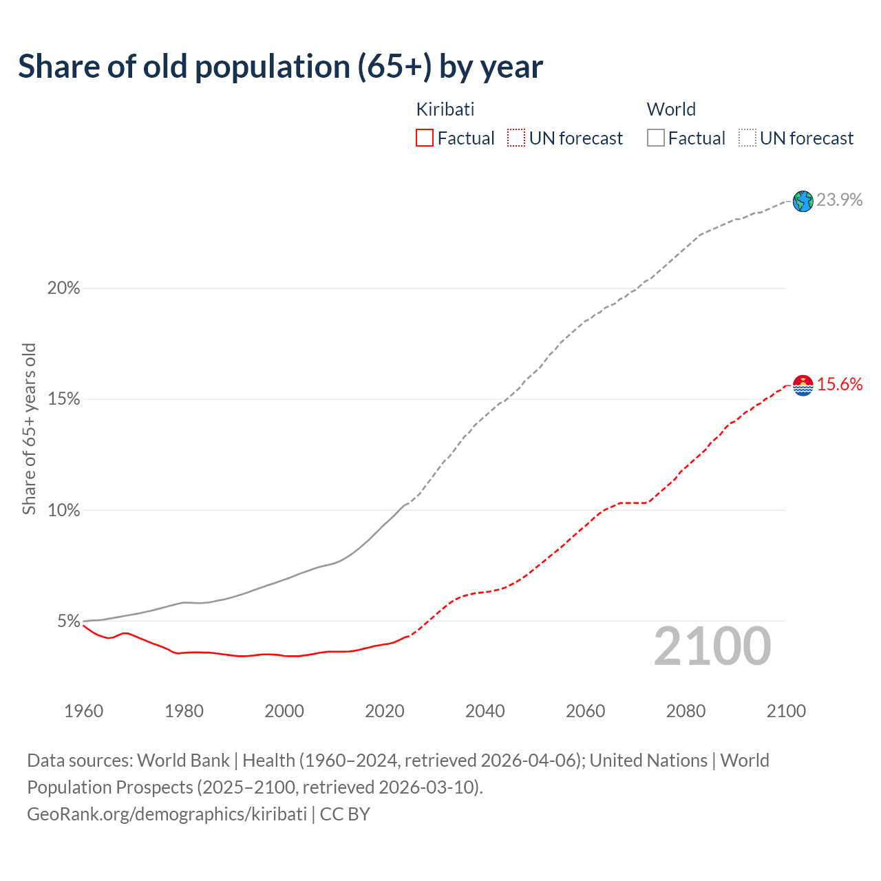 The share of older people aged 65 and over in Kiribati increased from 3.43% to 4.24% between 2004 and 2024.