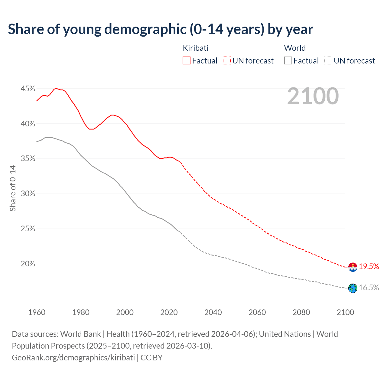 The share of children aged 0-14 in Kiribati decreased from 38.4% to 34.7% between 2004 and 2024 due to changes in birth rates.