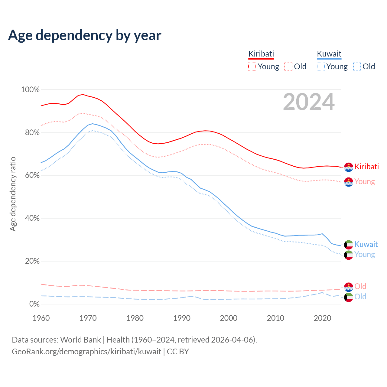 - The share of old-age demographic (65+) in Kiribati is 4.24% vs 3.1% in Kuwait.