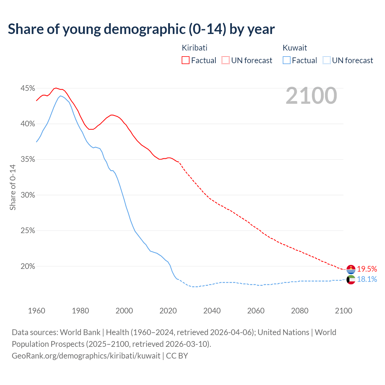 - The share of young demographic (0-15 years old) in Kiribati is 34.7% vs 18.2% in Kuwait.