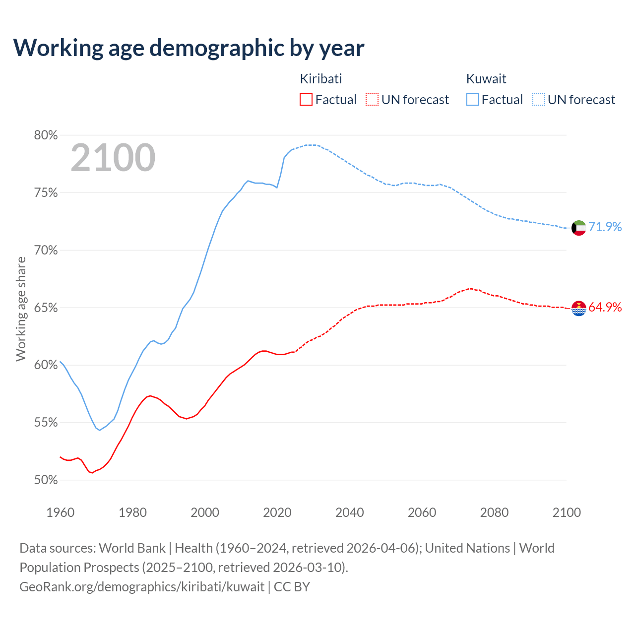 - Kiribati has 84.9K working age adults (aged 15-64) vs 4.01M in Kuwait.