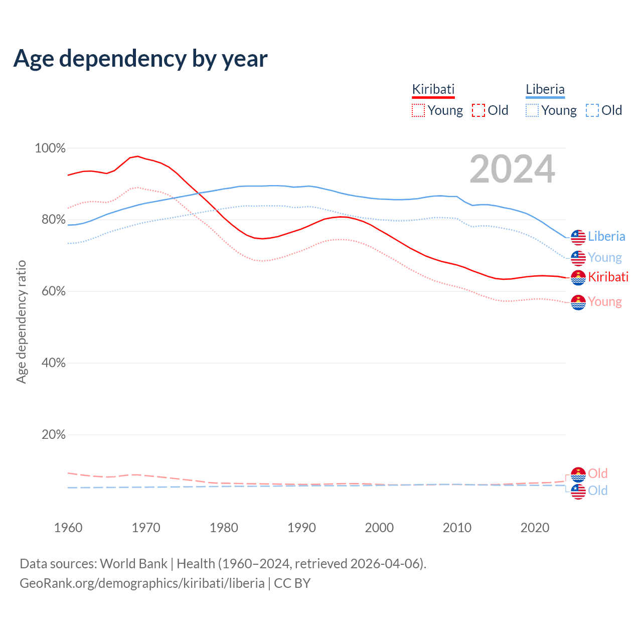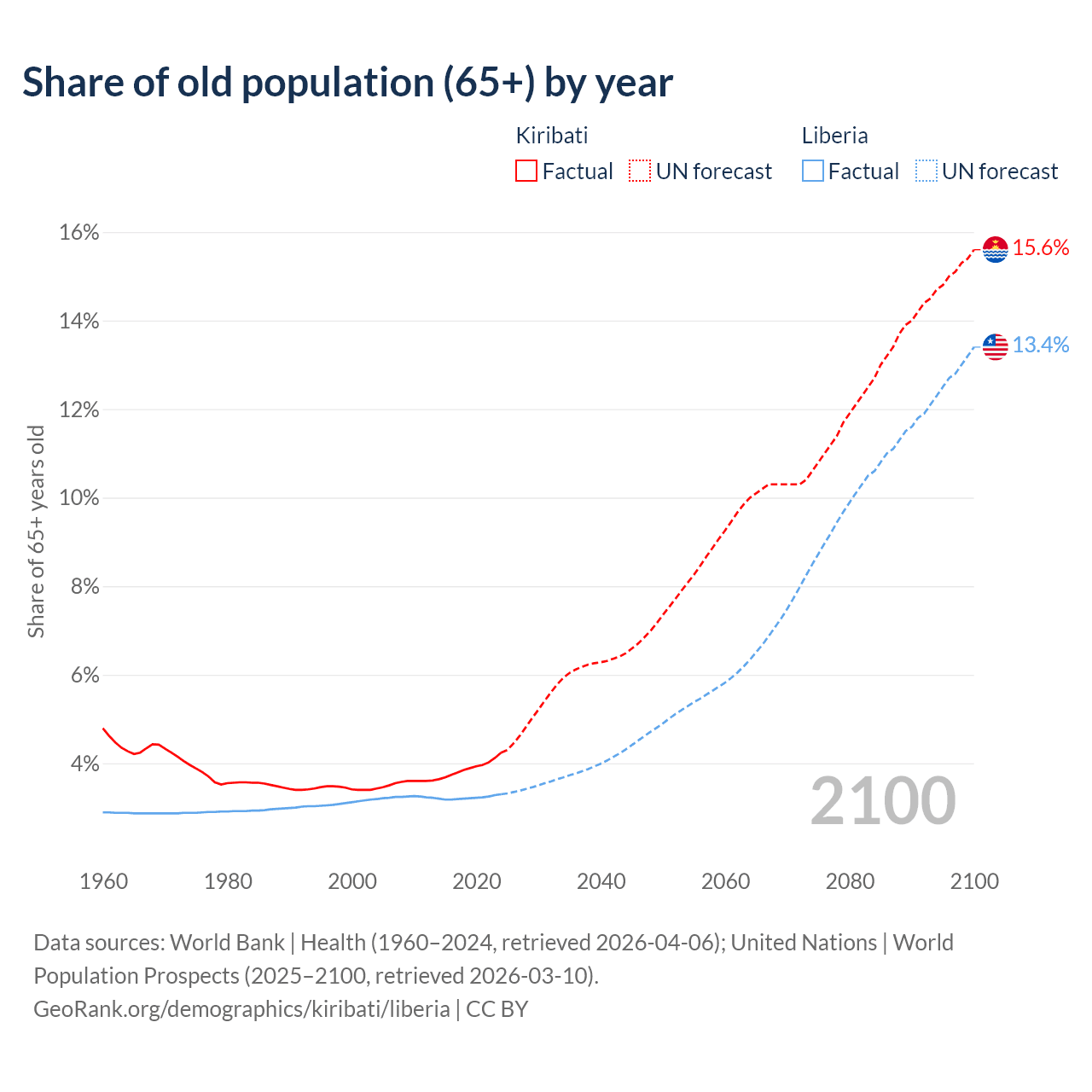 - The share of old-age demographic (65+) in Kiribati is 4.24% vs 3.3% in Liberia.