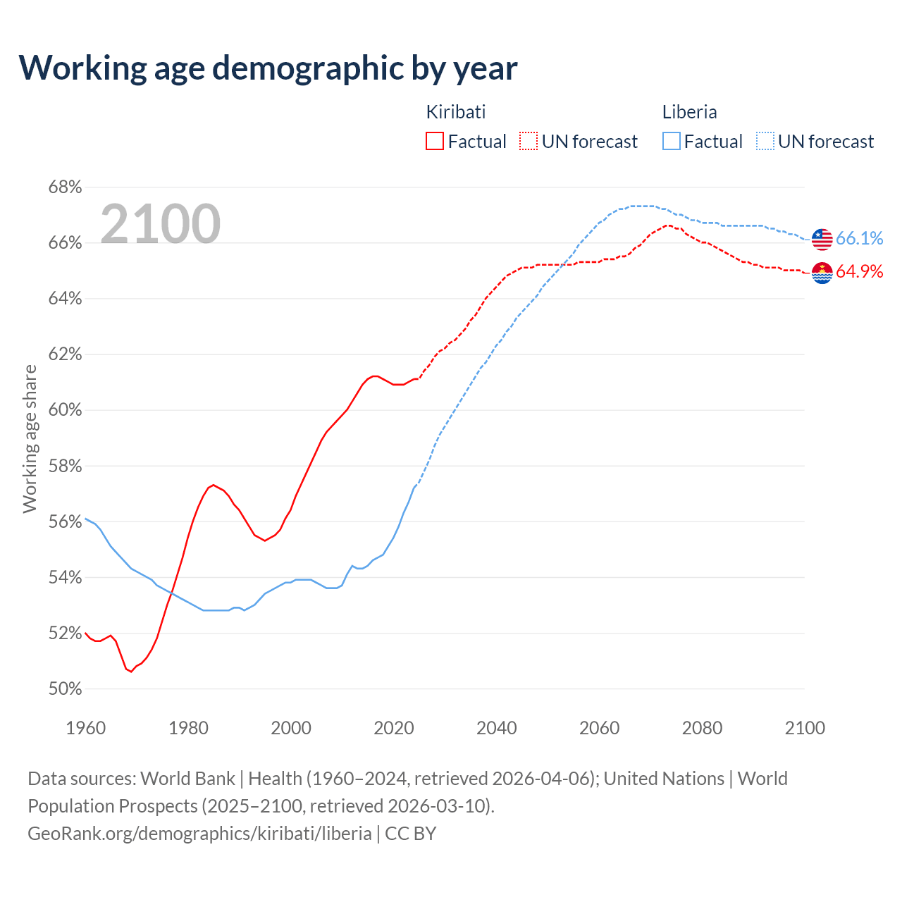 - Kiribati has 84.9K working age adults (aged 15-64) vs 3.37M in Liberia.