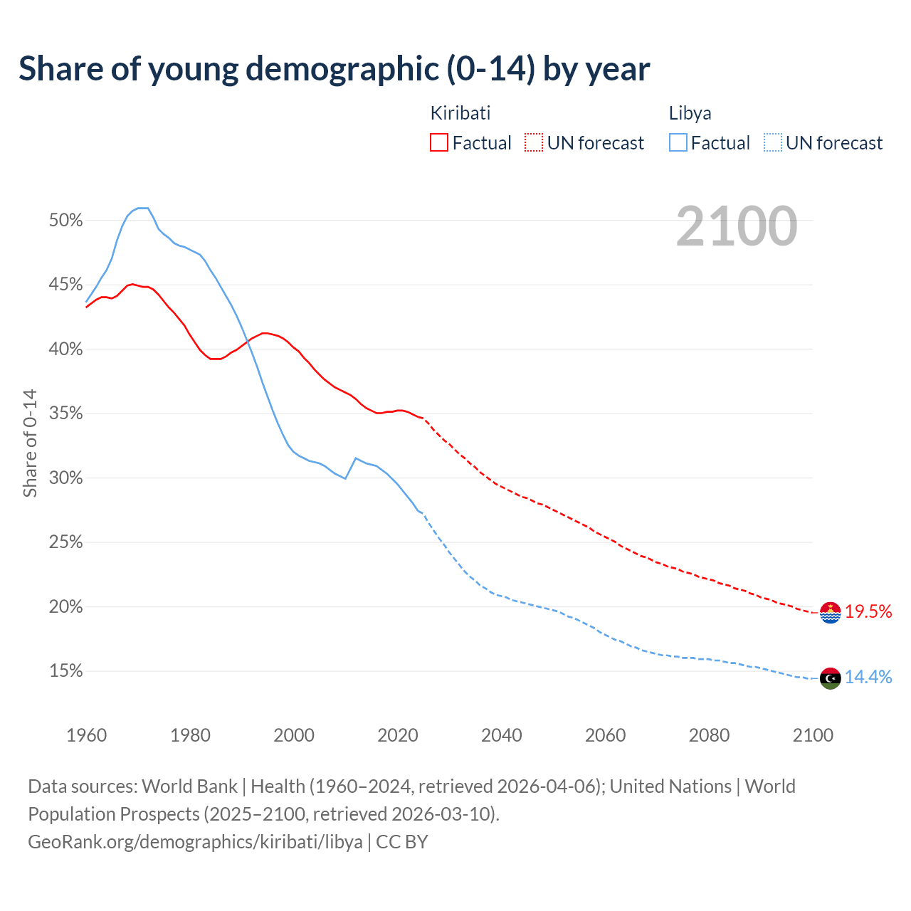 - The share of young demographic (0-15 years old) in Kiribati is 34.7% vs 27.4% in Libya.