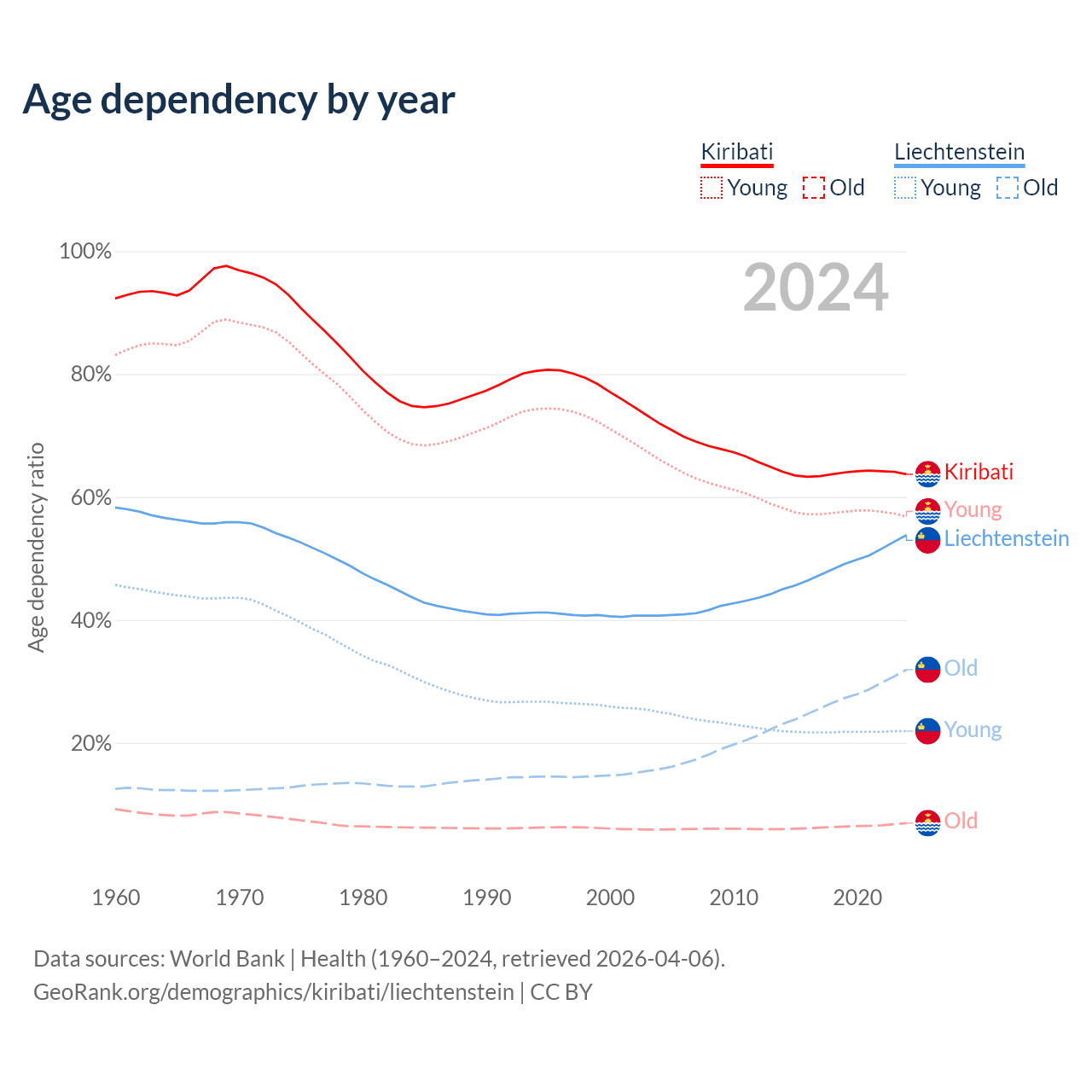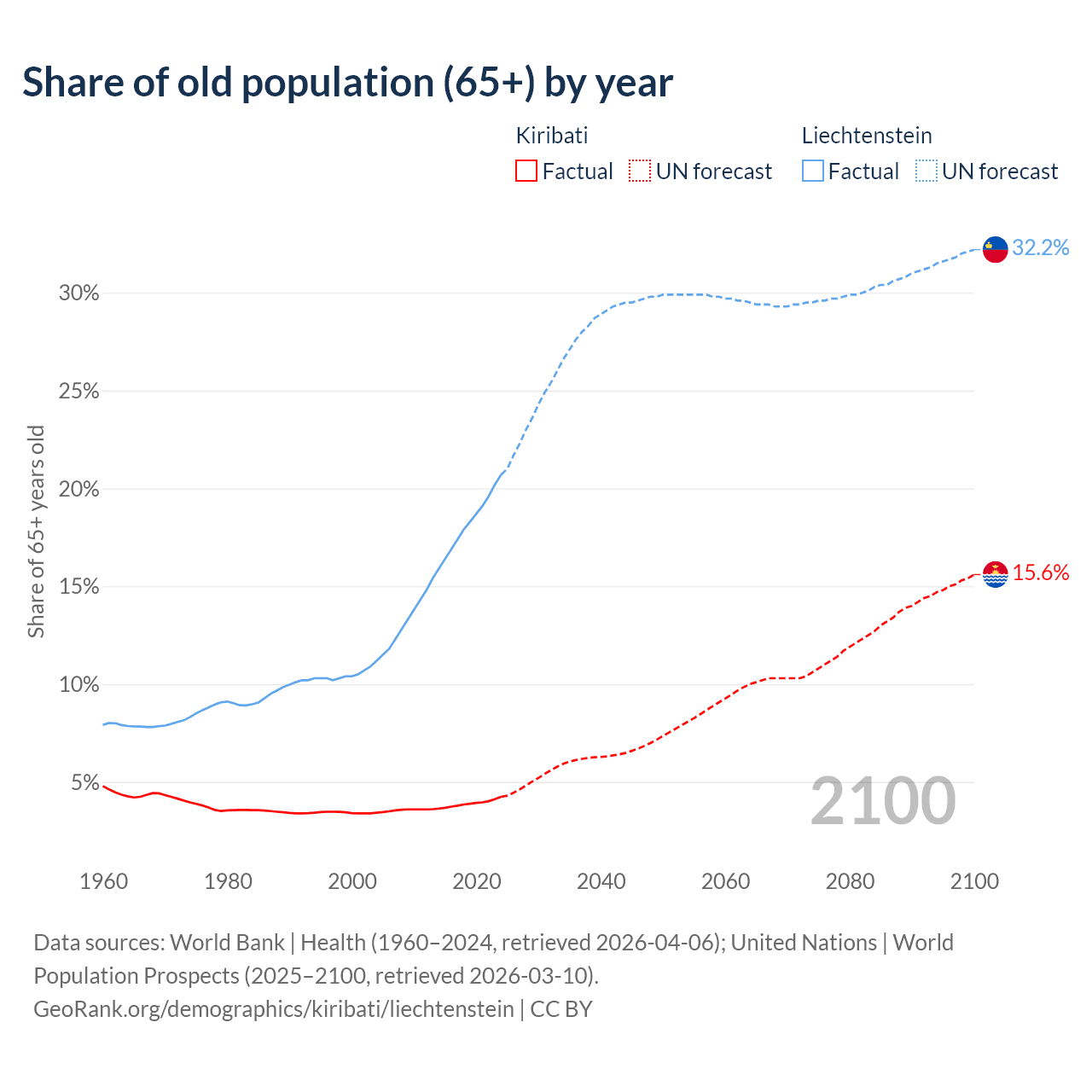 - The share of old-age demographic (65+) in Kiribati is 4.24% vs 20.7% in Liechtenstein.