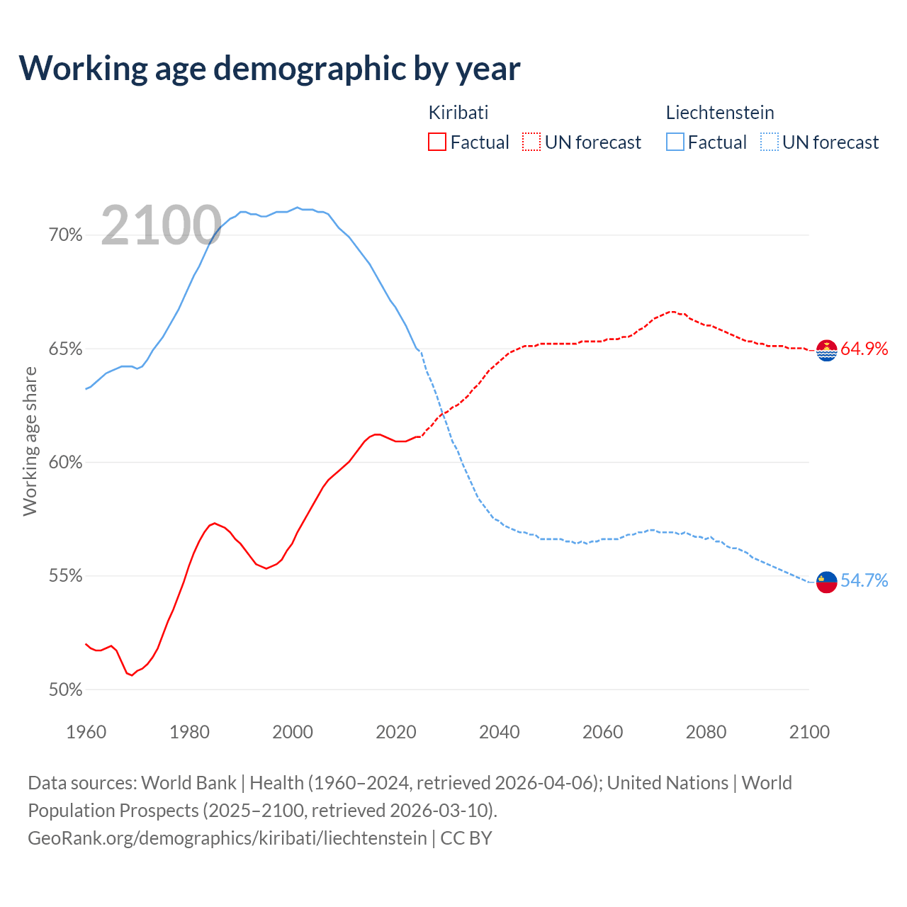 - Kiribati has 84.9K working age adults (aged 15-64) vs 26.7K in Liechtenstein.