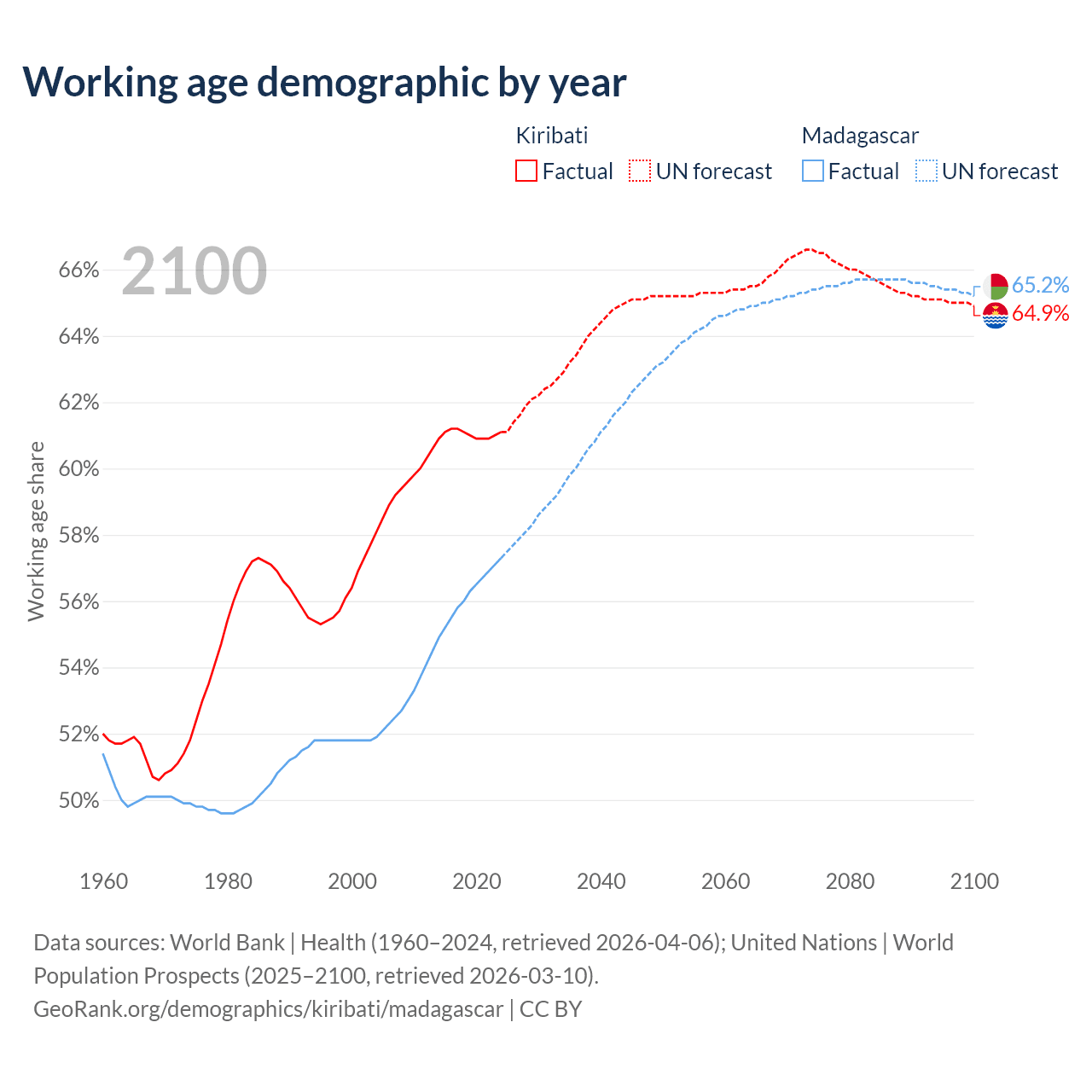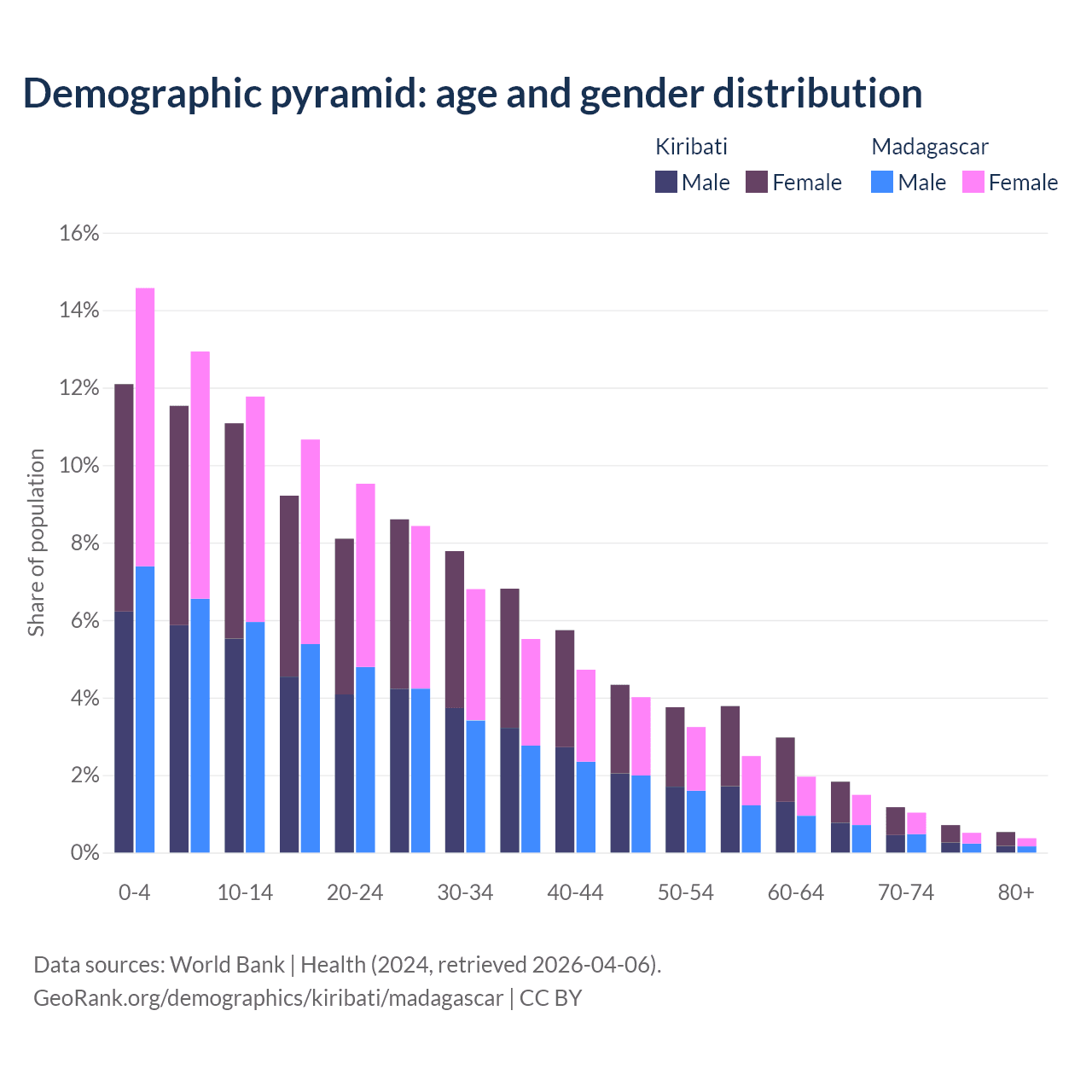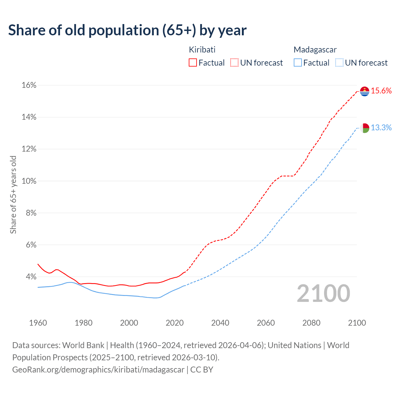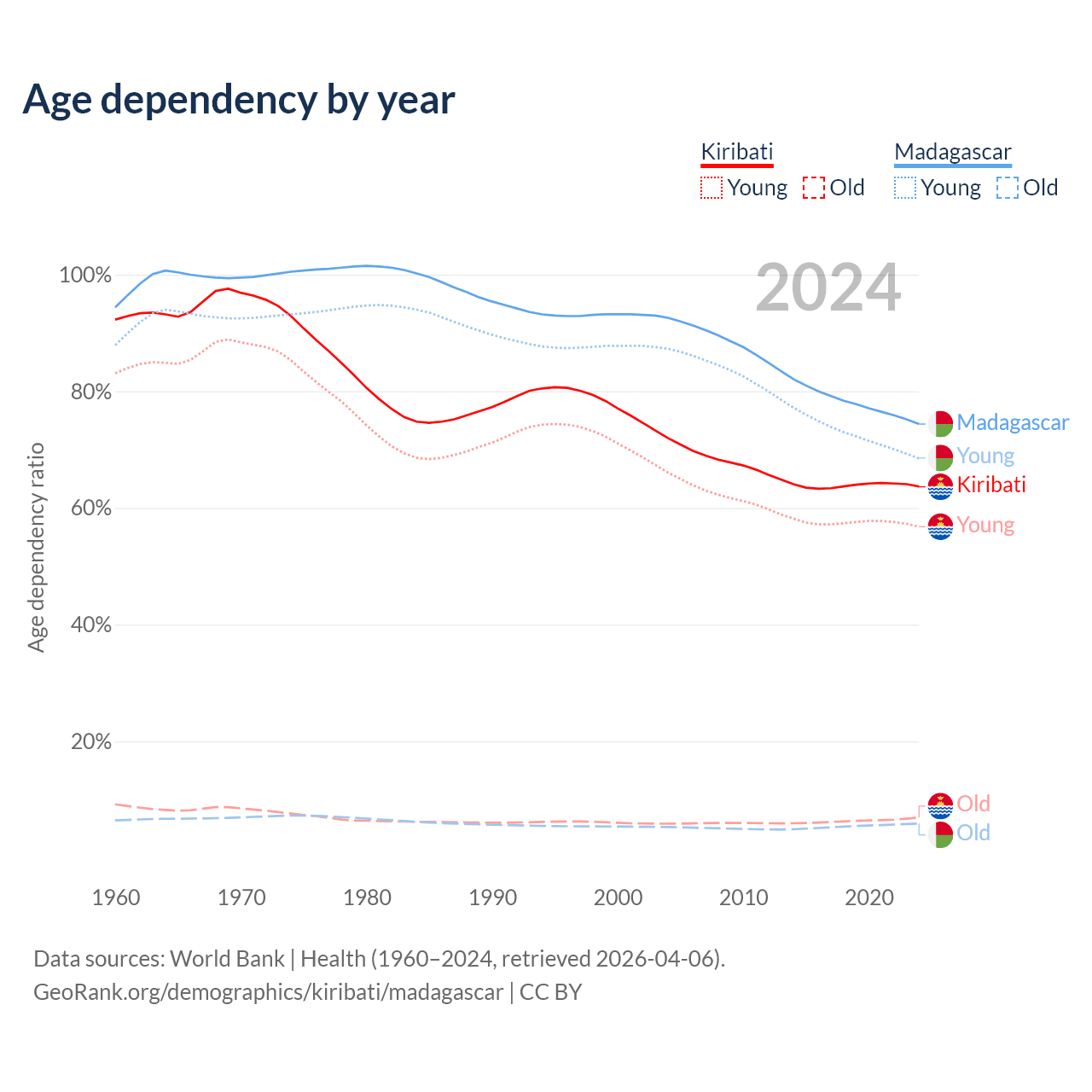 - The share of old-age demographic (65+) in Kiribati is 4.24% vs 3.41% in Madagascar.