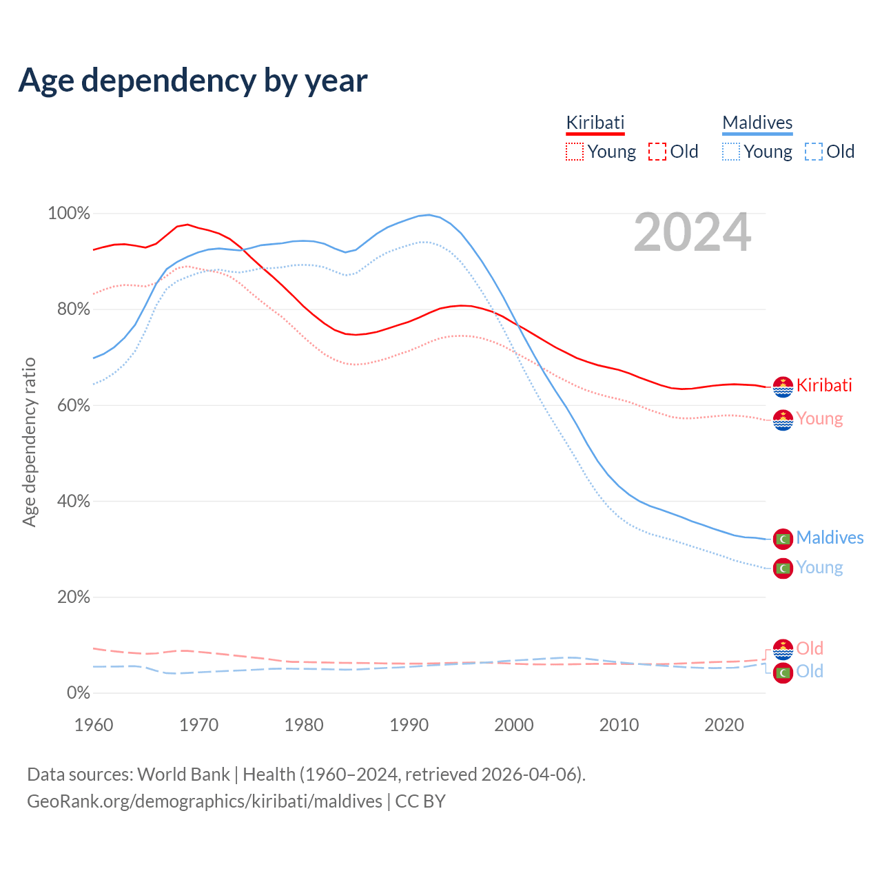 - The share of old-age demographic (65+) in Kiribati is 4.24% vs 4.64% in Maldives.