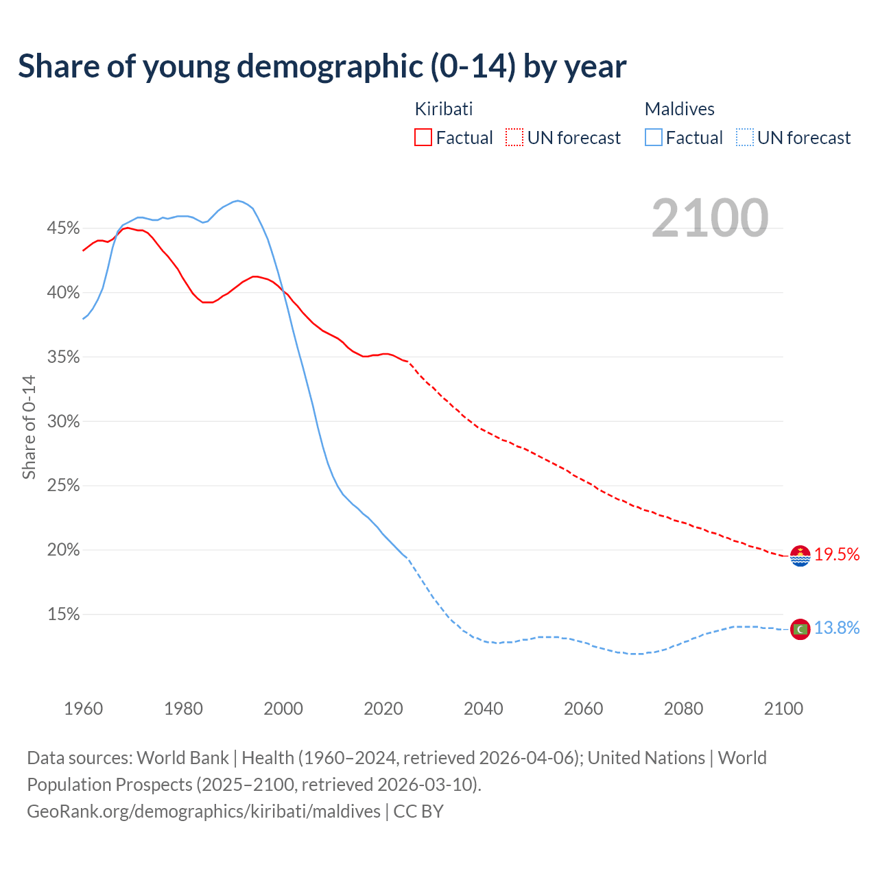 - The share of young demographic (0-15 years old) in Kiribati is 34.7% vs 19.6% in Maldives.