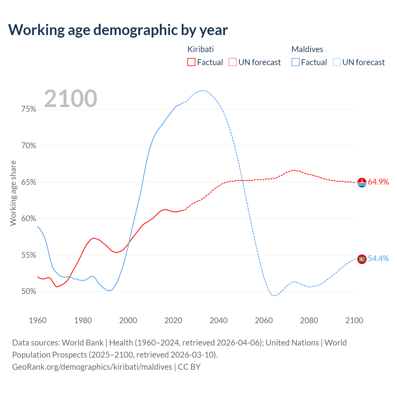 - Kiribati has 84.9K working age adults (aged 15-64) vs 403K in Maldives.
