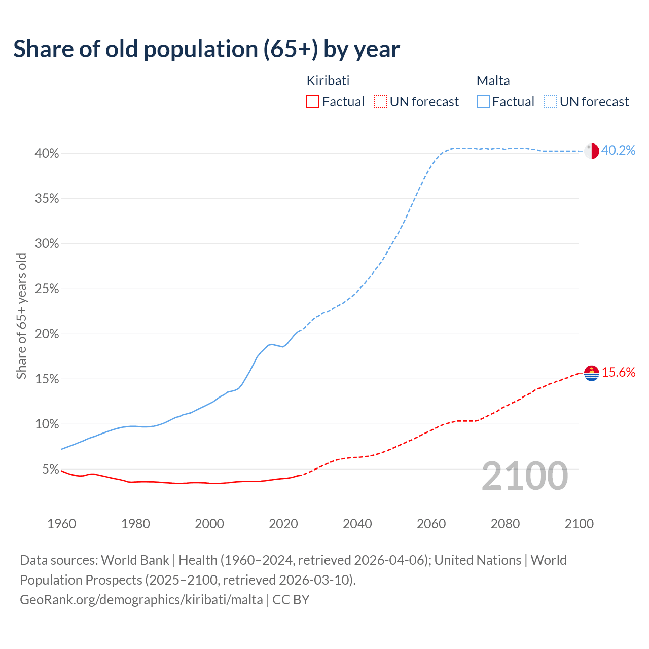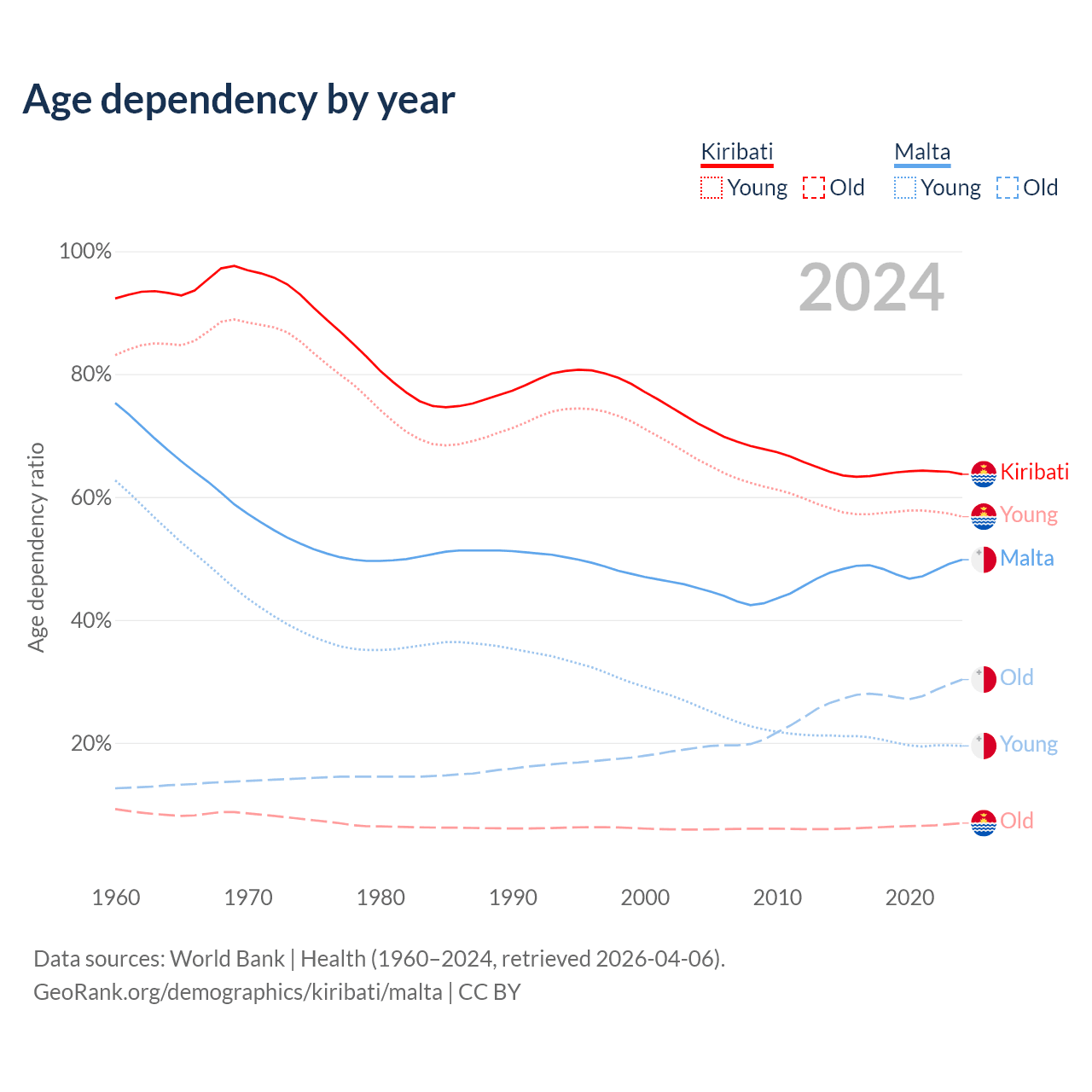 - The share of old-age demographic (65+) in Kiribati is 4.24% vs 20.2% in Malta.