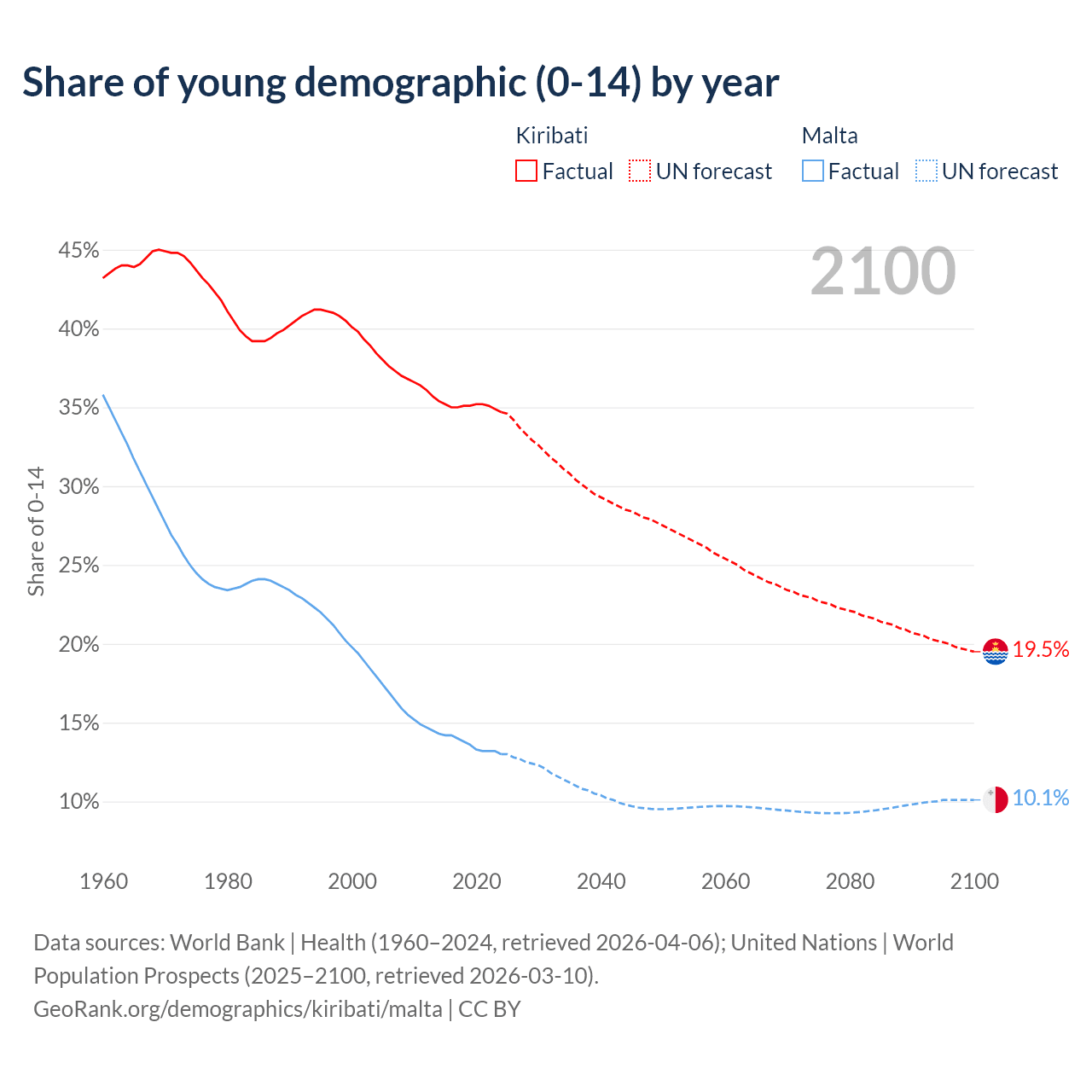 - The share of young demographic (0-15 years old) in Kiribati is 34.7% vs 13% in Malta.