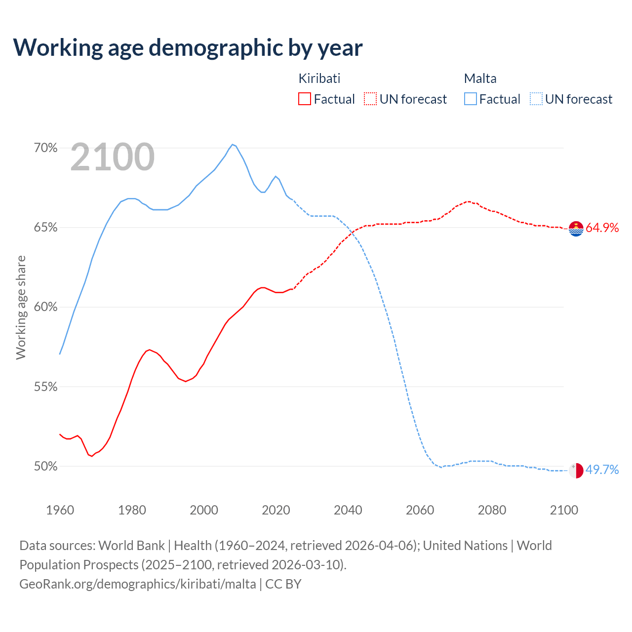 The share of older people aged 65 and over is 4.24% in Kiribati and 20.2% in Malta. Life expectancy in Kiribati compared to Malta .