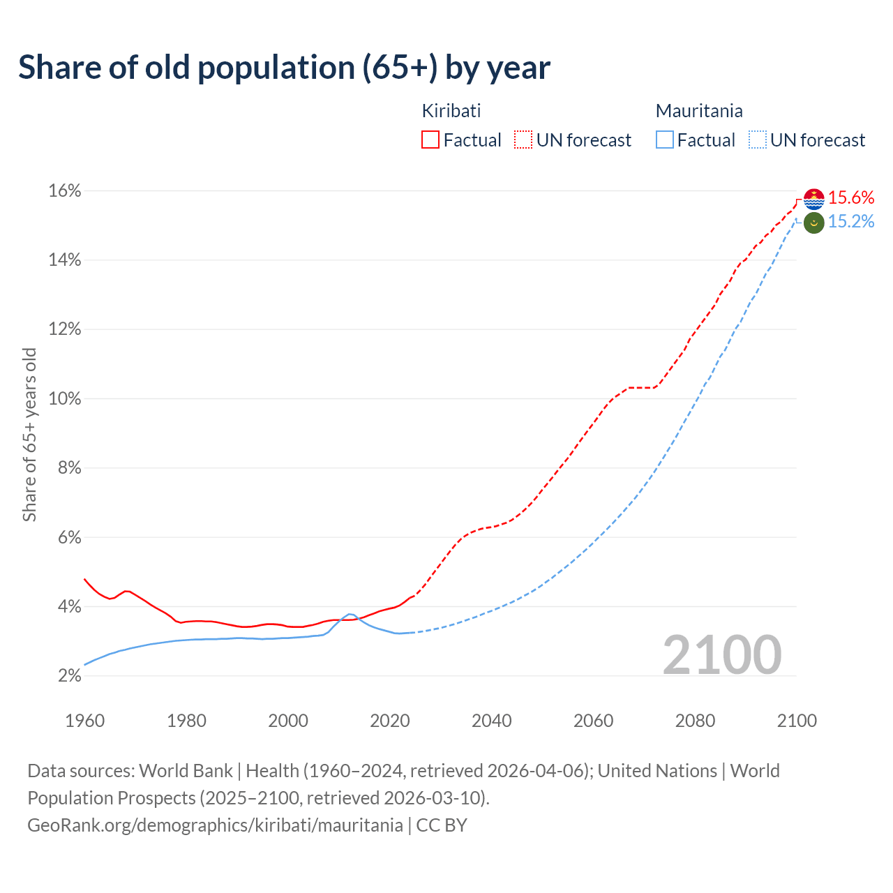 - The share of old-age demographic (65+) in Kiribati is 4.24% vs 3.23% in Mauritania.