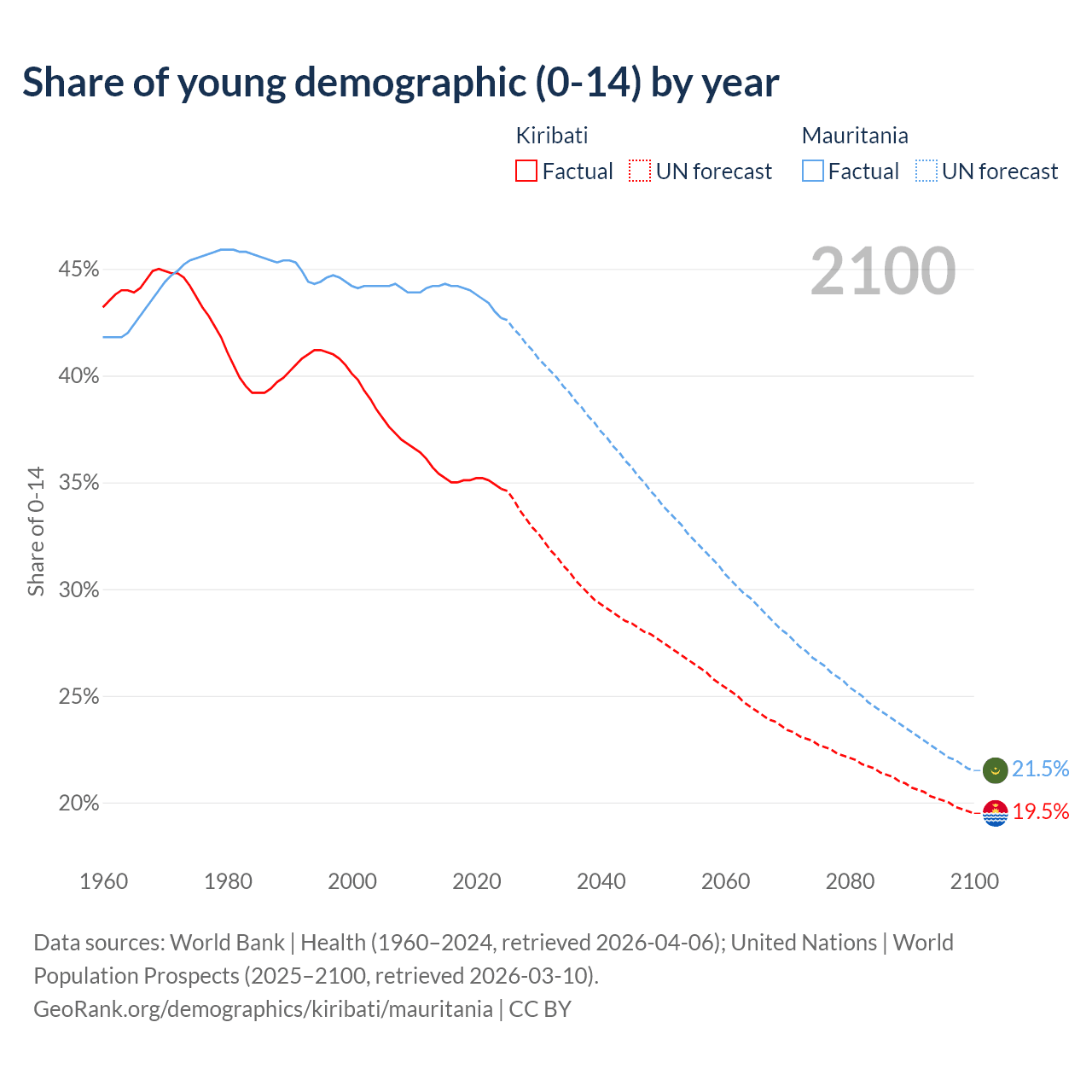 - The share of young demographic (0-15 years old) in Kiribati is 34.7% vs 42.7% in Mauritania.